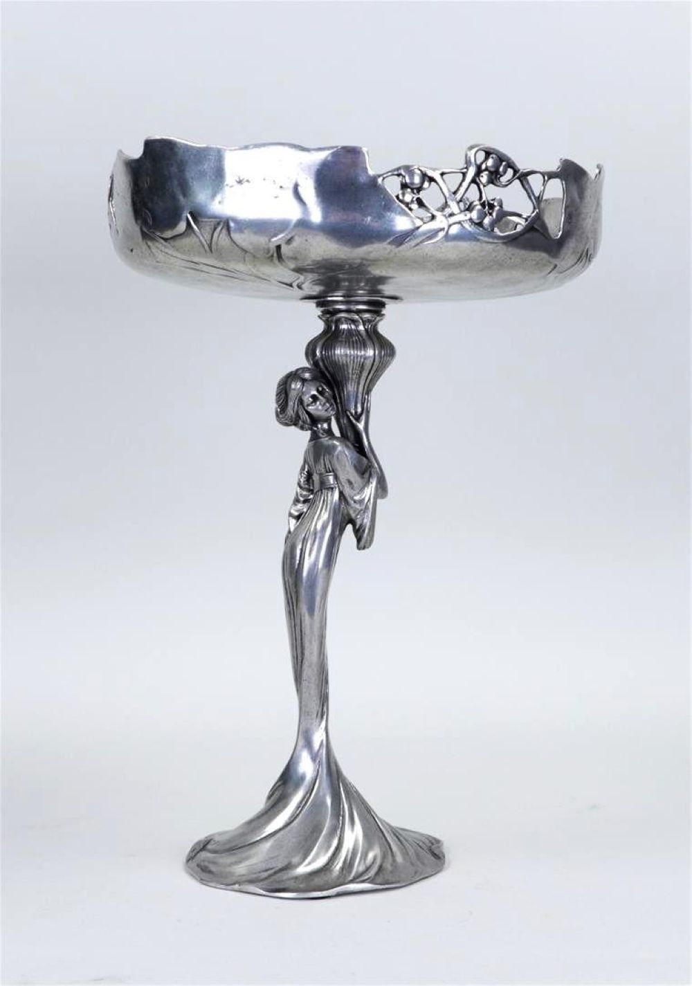 A pewter Art Nouveau table piece in the shape of a lady holding up a bowl,...