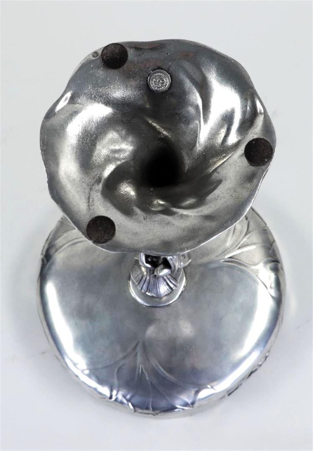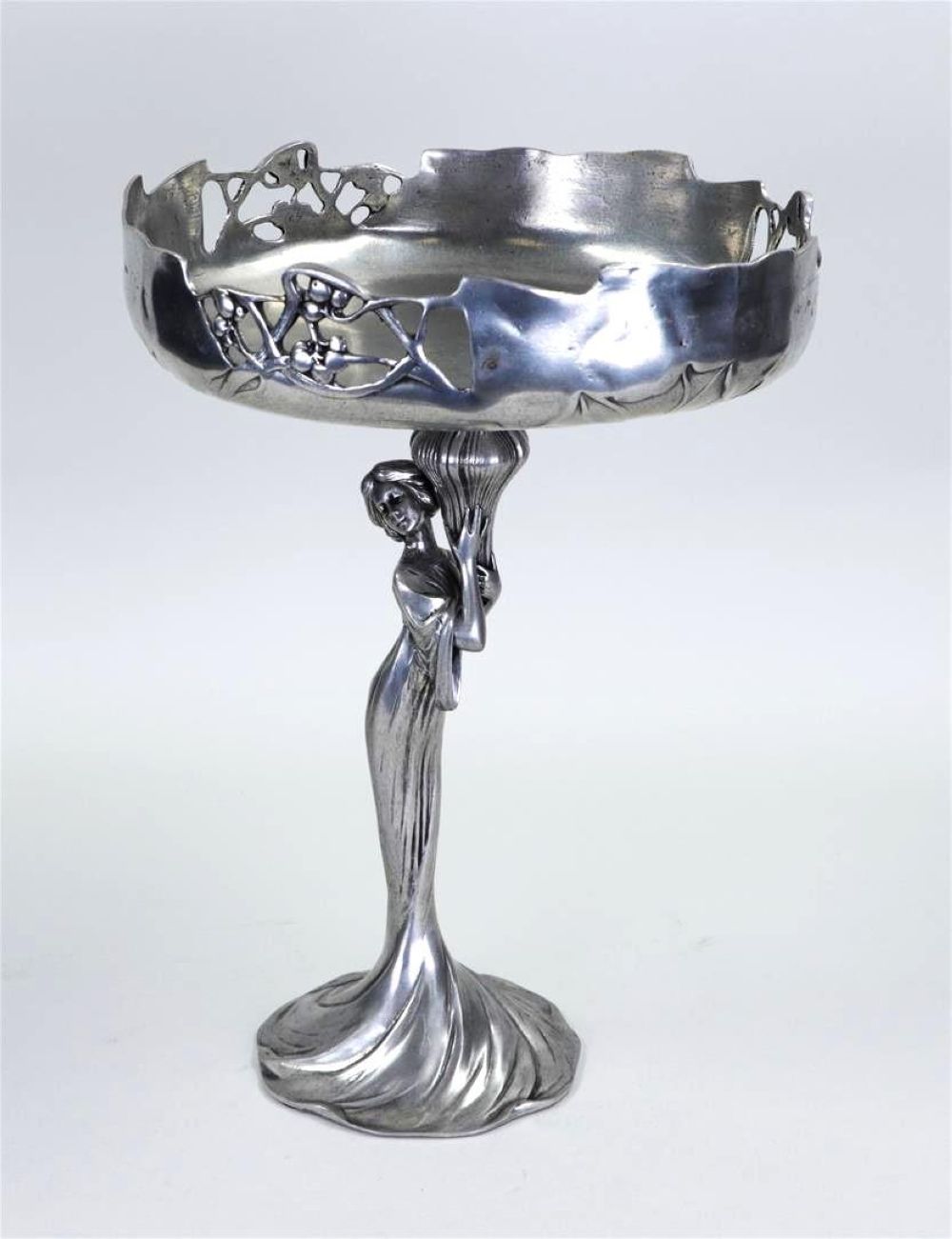 A pewter Art Nouveau table piece in the shape of a lady holding up a bowl, marked on the bottom.