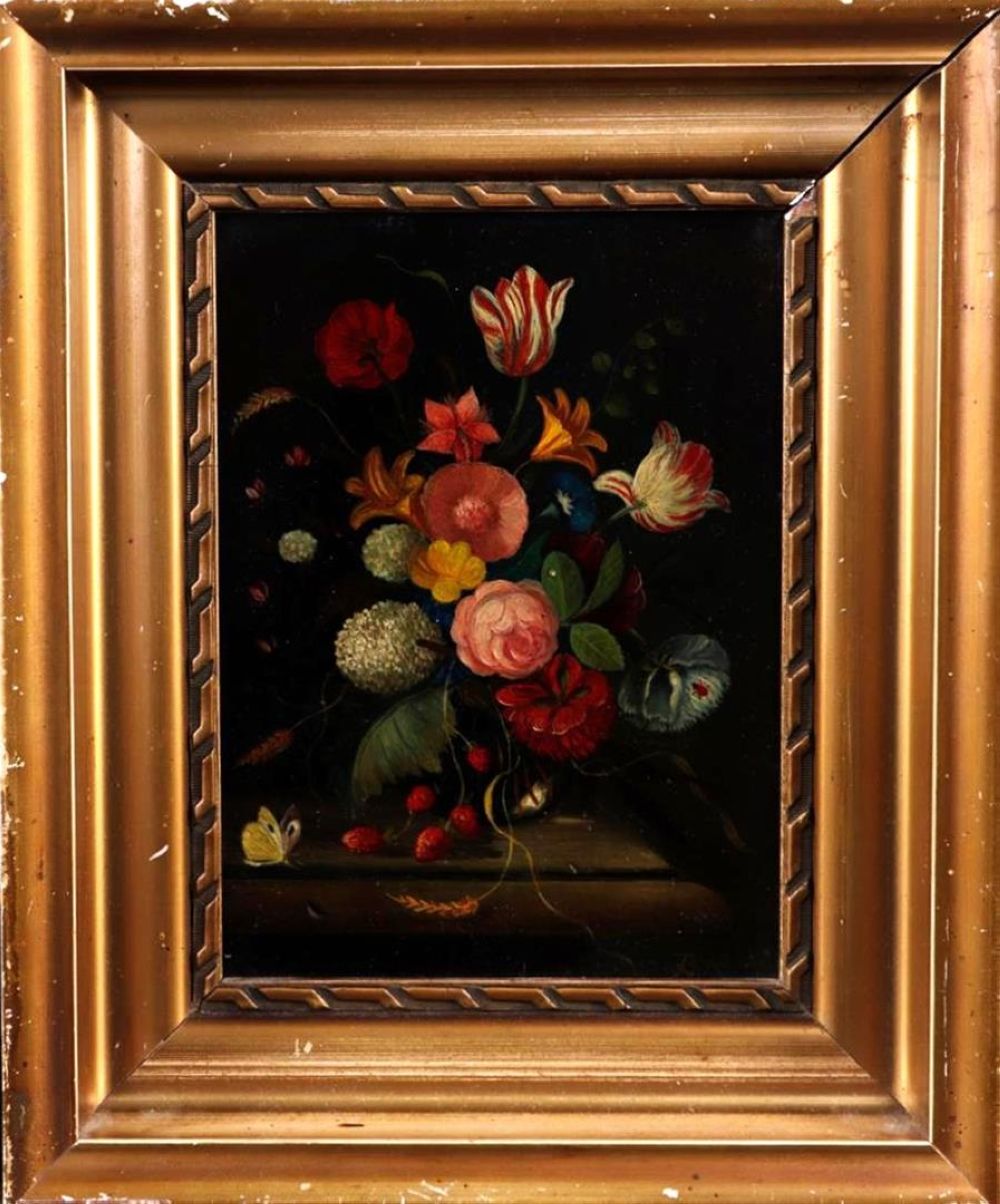 Lot 1063 | Dutch School, ca. 1900. Still Life of Flowers in a Glass Bottle on a Table....