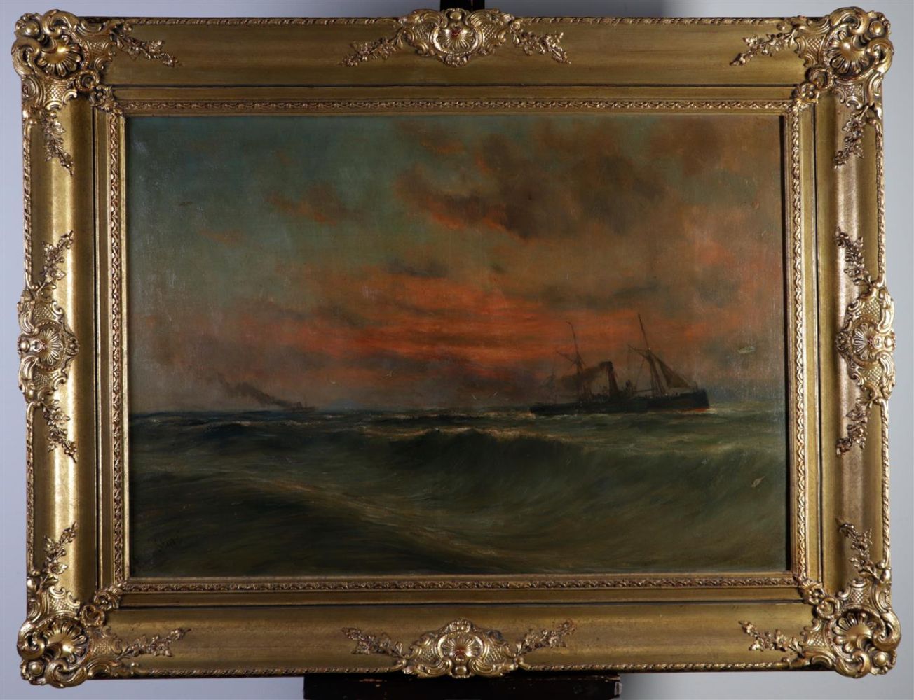 Romain Steppe (1859 - 1927), A steam sailor at sea at sunset, signed (lower left), oil on canvas,