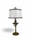 A brass standing lamp and the shape of a Roman oil lamp. On top a white hood....