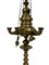 A brass standing lamp and the shape of a Roman oil lamp. On top a white hood. Height: 92 cm.