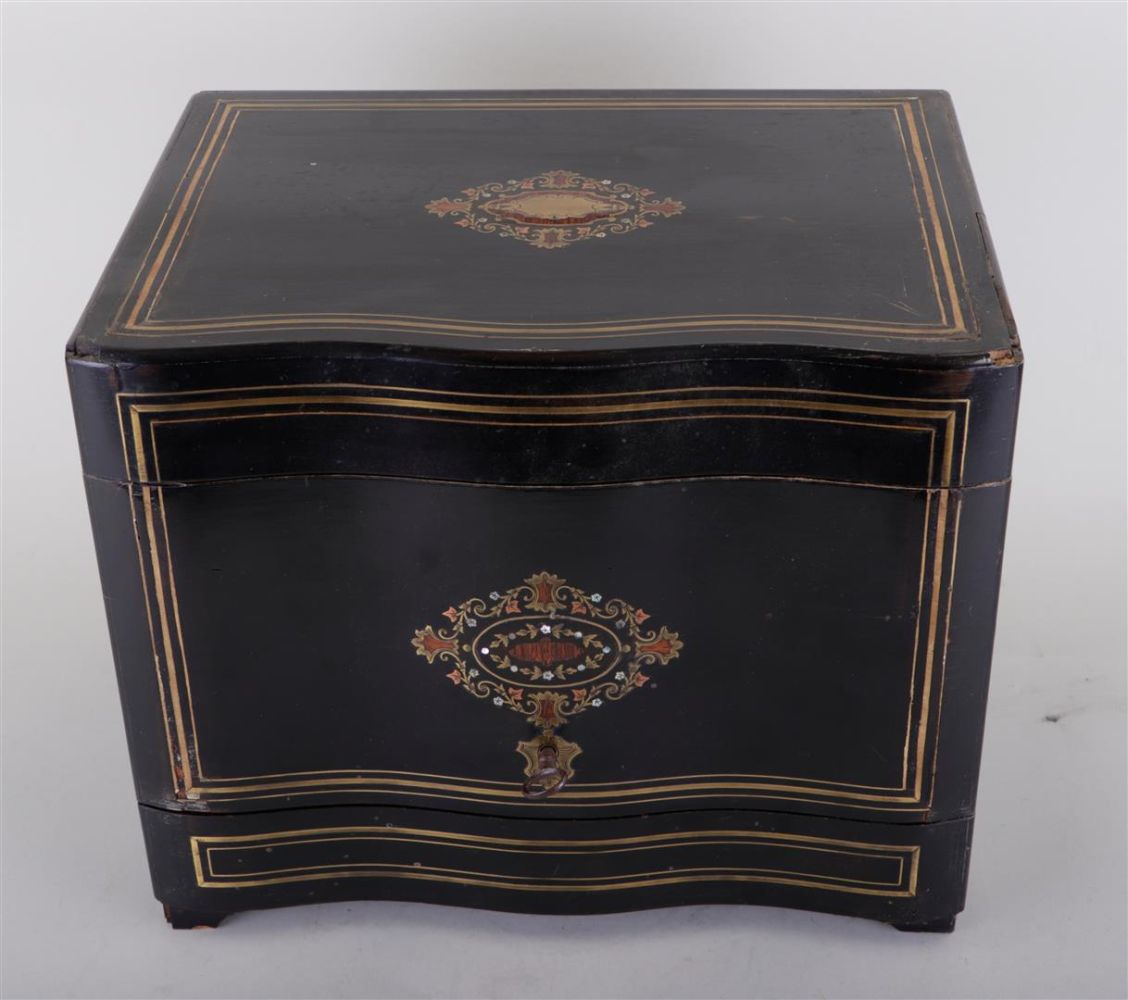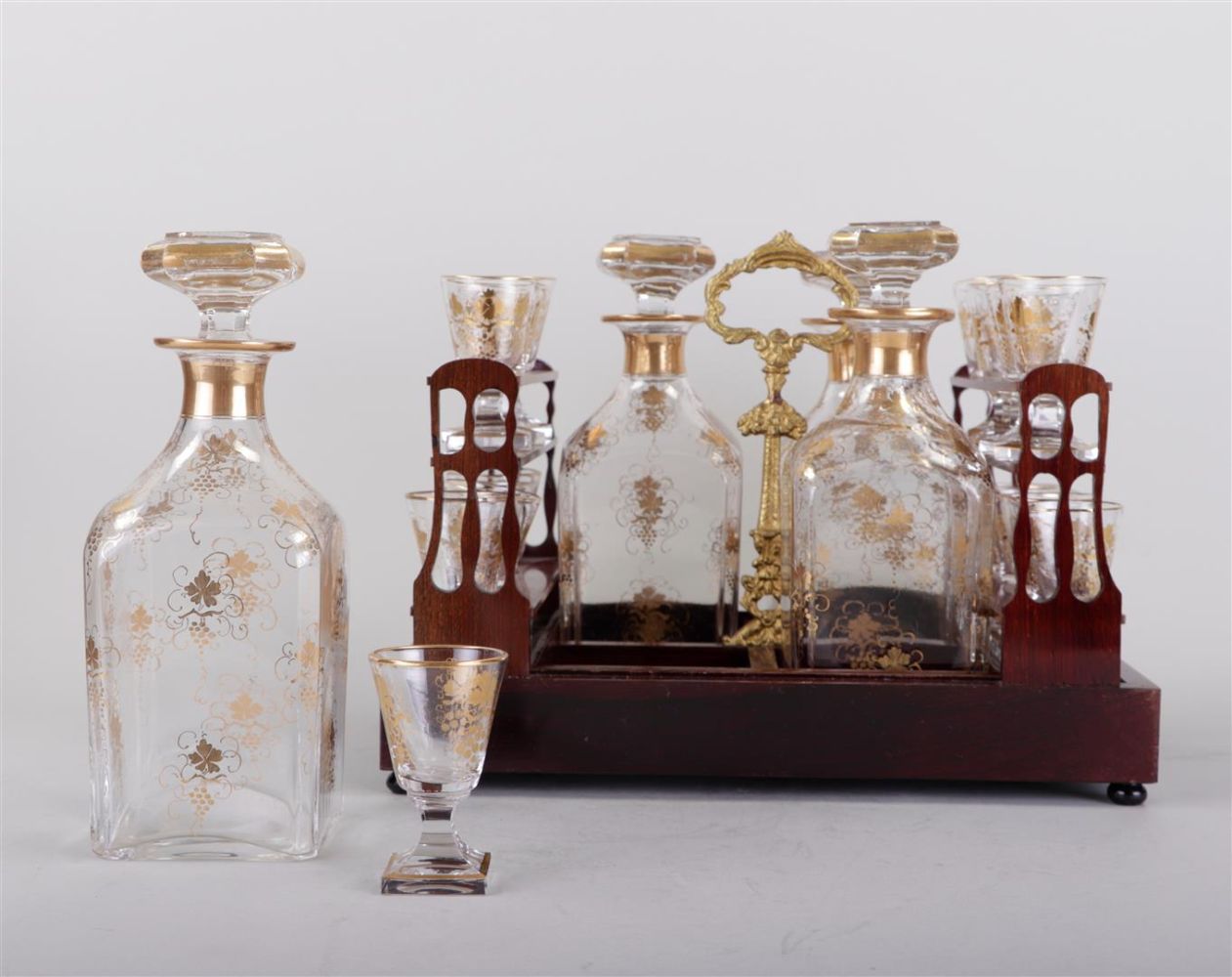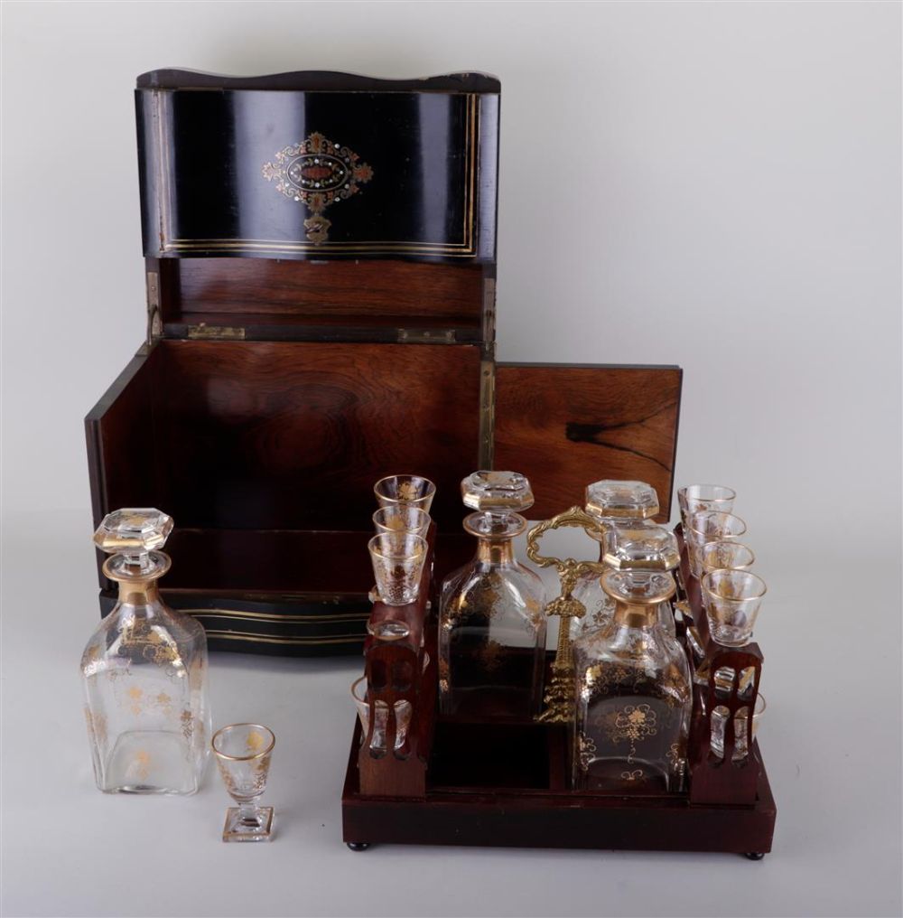 A French Boulle liqueur cellar filled with (8) glasses, and (4) carafes....