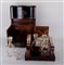 A French Boulle liqueur cellar filled with (8) glasses, and (4) carafes. Circa 1830.