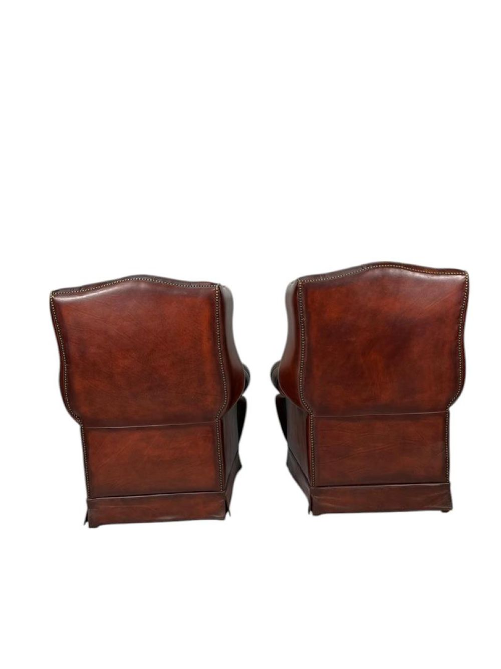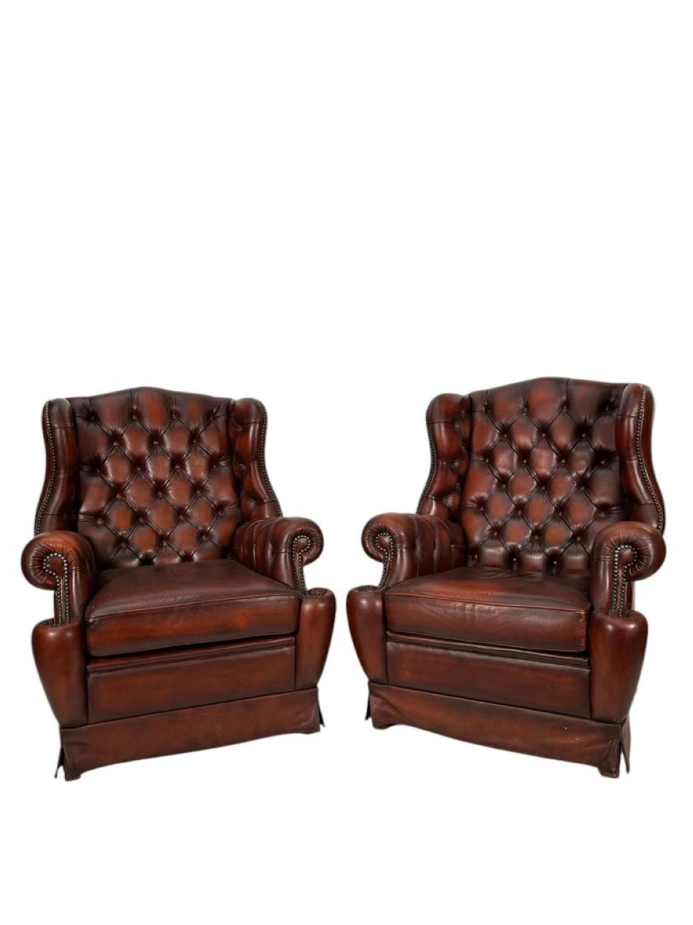 A lot of (2) tufted Chesterfield style wing chairs upholstered in brown leather. 20th century.