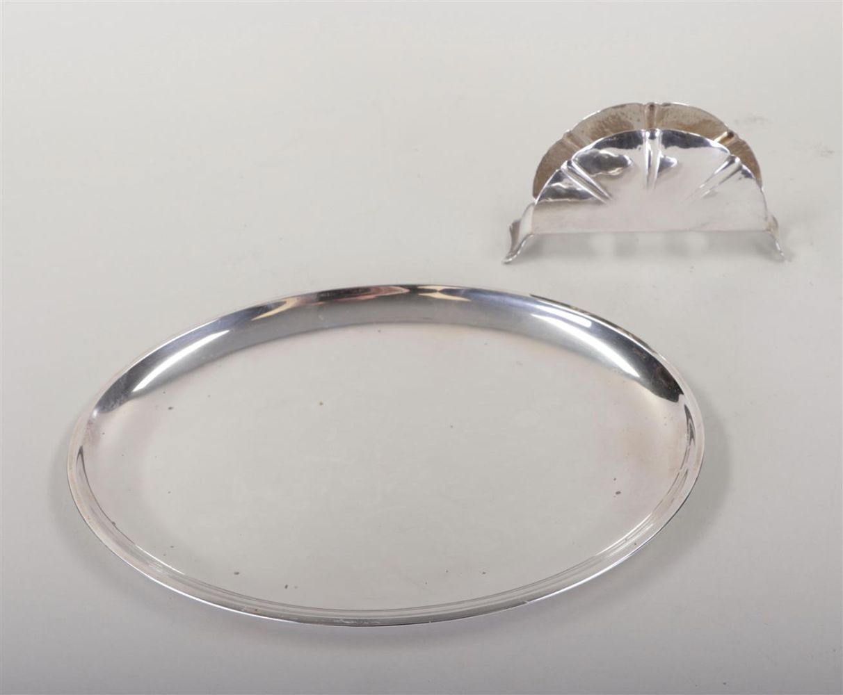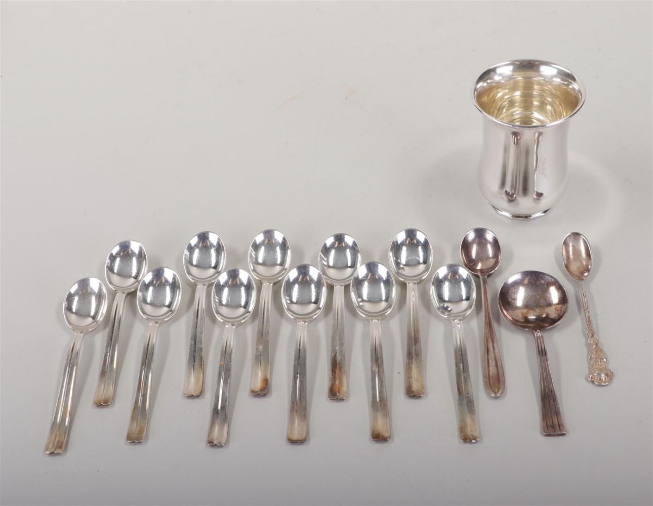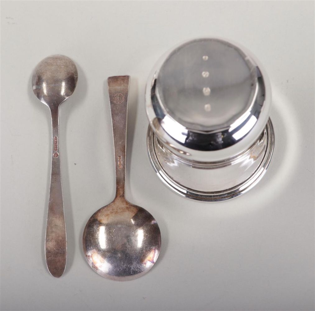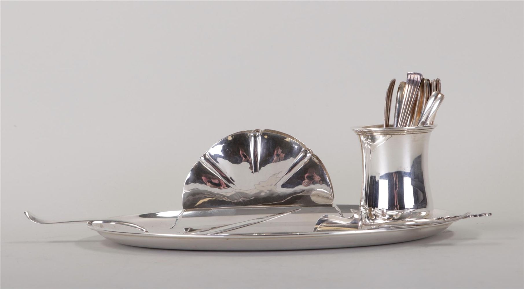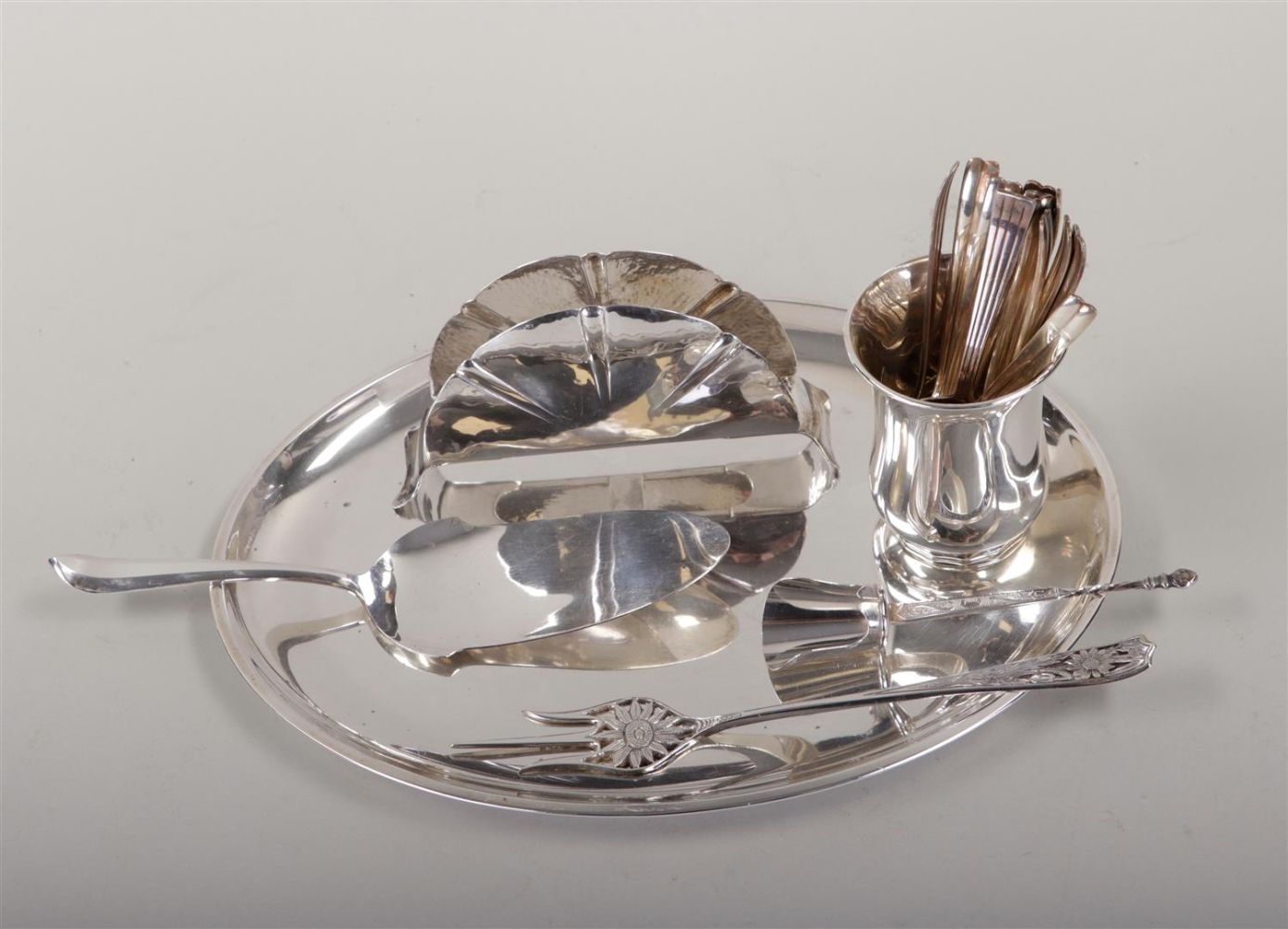 A lot of various silver, including a tray, a pickle fork, a cake server, a spoon vase with contents, a napkin holder, and a sugar scoop. Weight 296.2 grams. (excluding spoons). (NB: spoons silver-plated.)