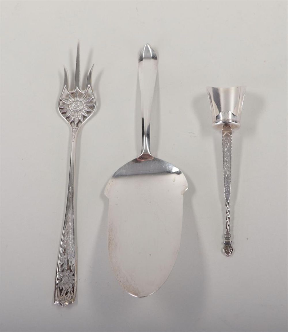 A lot of various silver, including a tray, a pickle fork, a cake server, a...