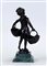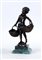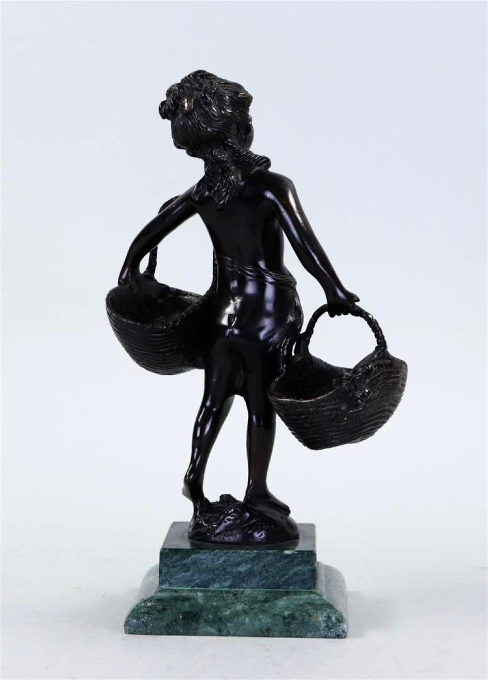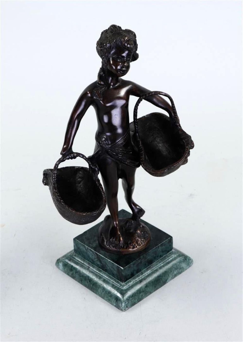 A bronze patinated sculpture of a girl with baskets, honed on a green marble base.