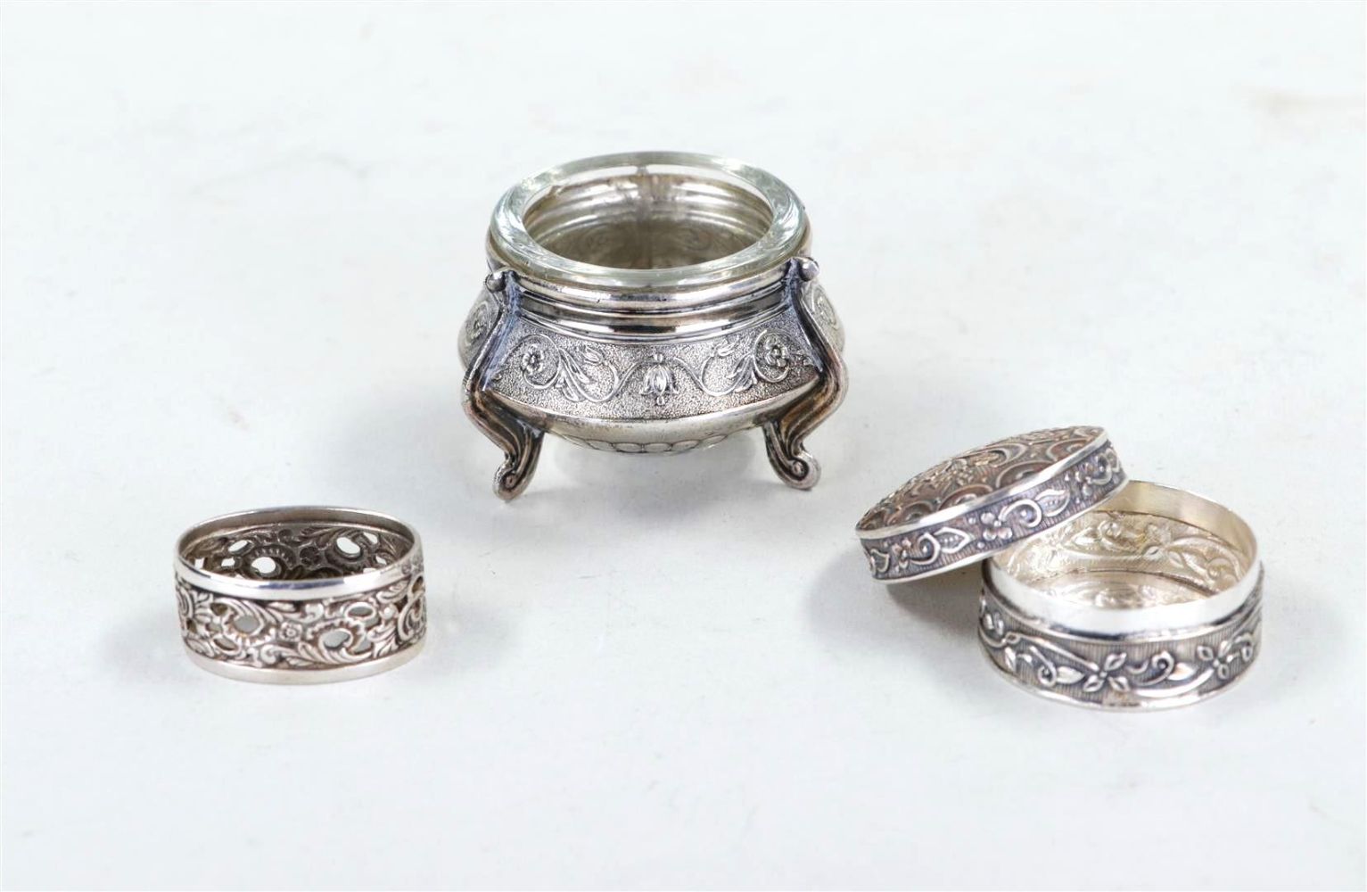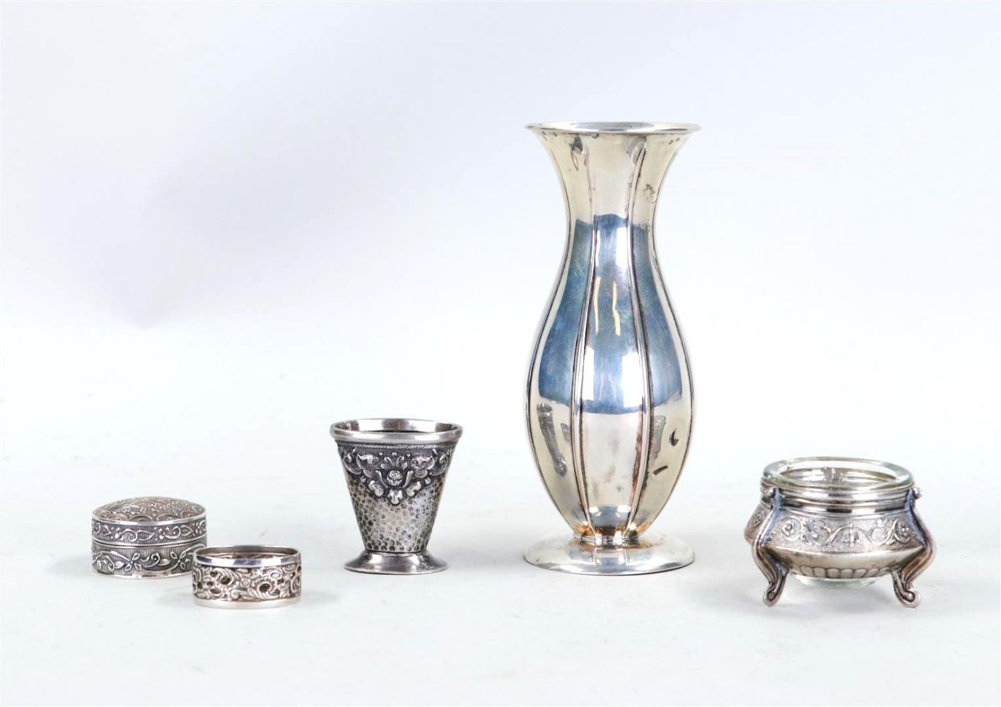 A lot of various silver including a flower vase, a pill box, a salt cellar, a finger cloth ring, and a toothpick holder. (5). Weight: 147 cm. (excl. glass bowl).