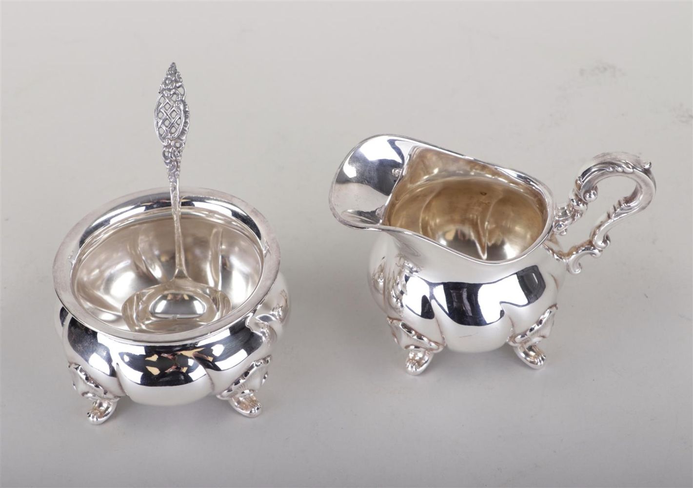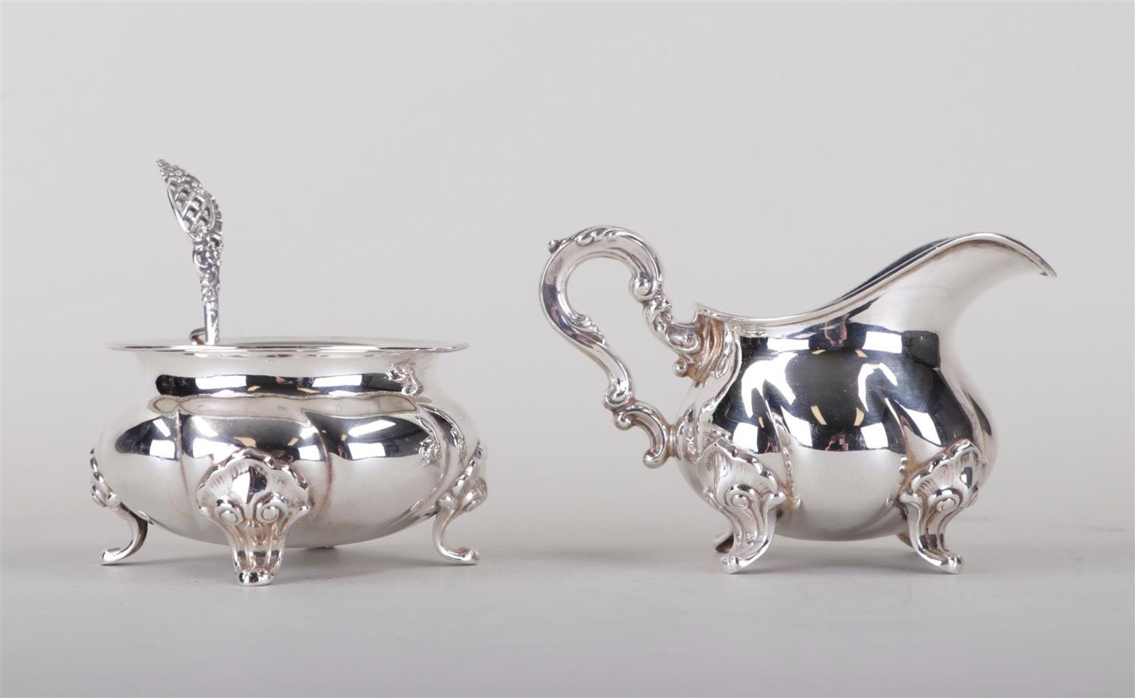 A silver cream set with sugar spoon, second grade, 224.4 grams. Marked on the...