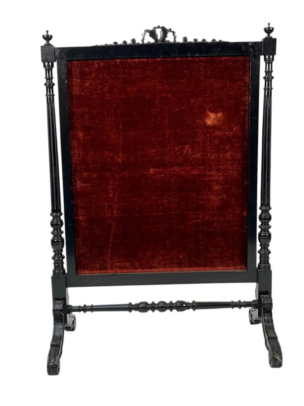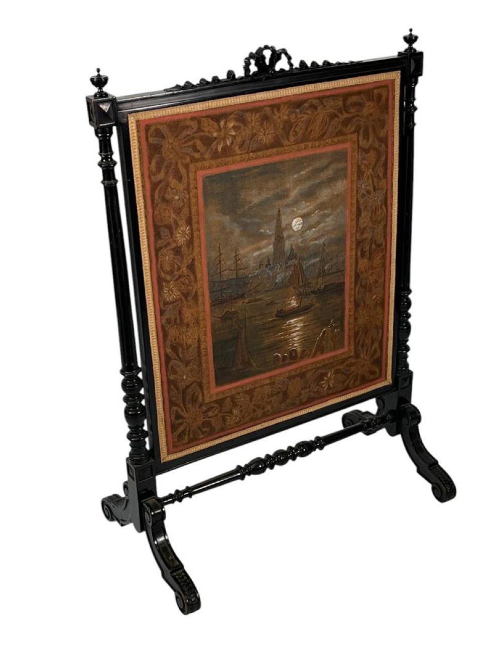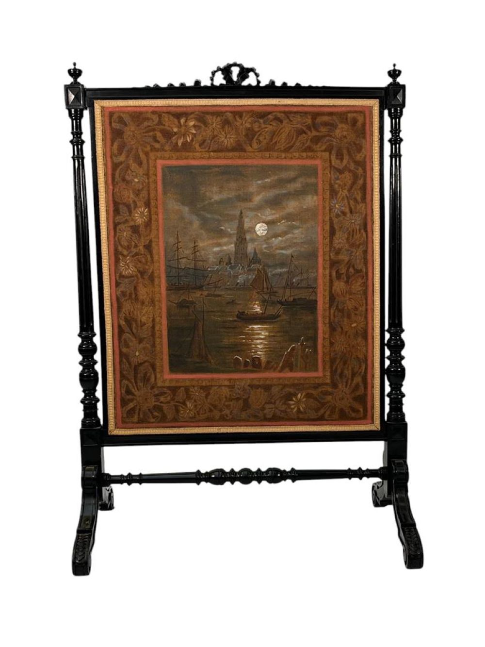 A blackened wooden fire screen, depicting the port of Antwerp. ca. 1880.105 x...