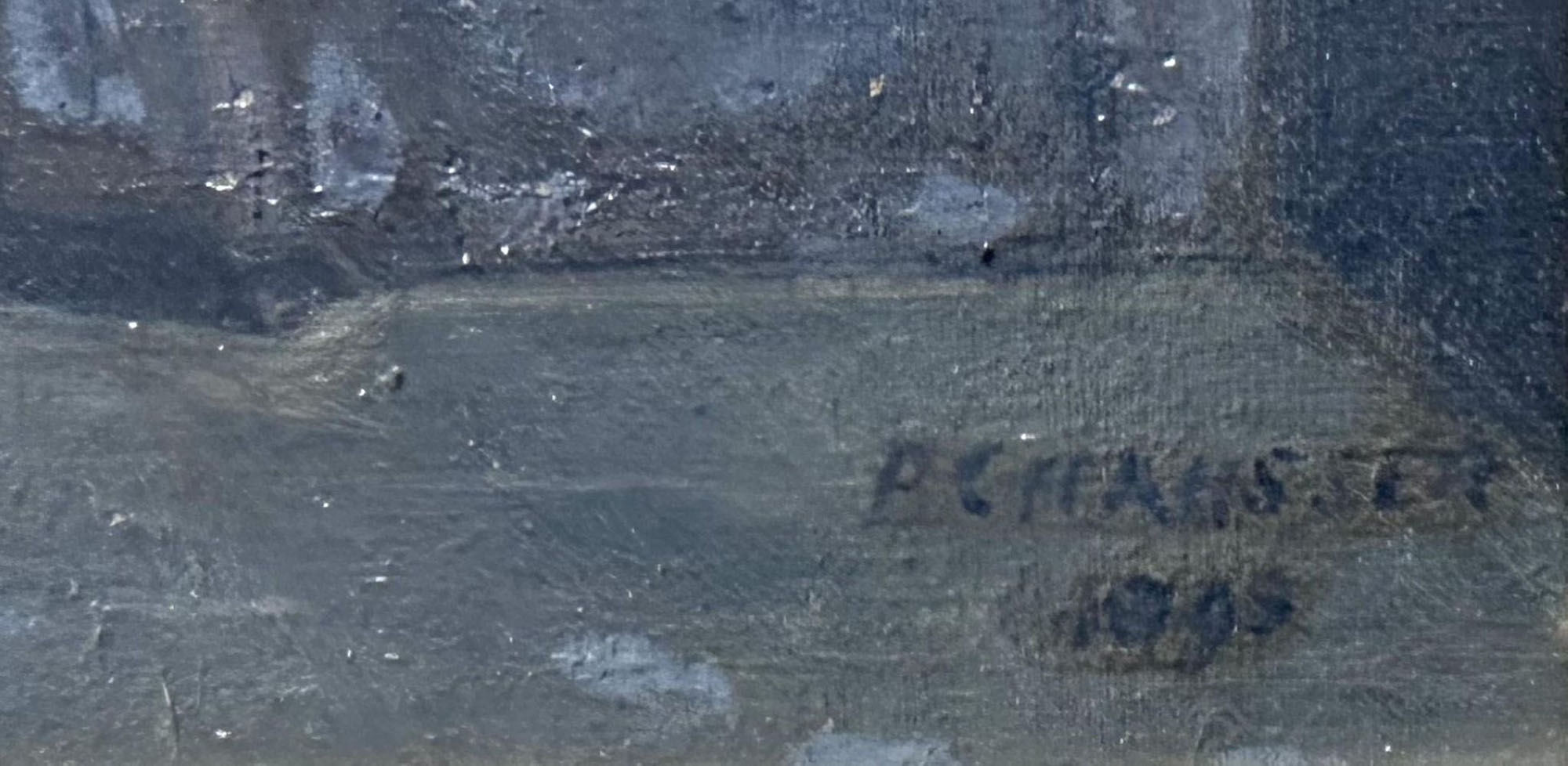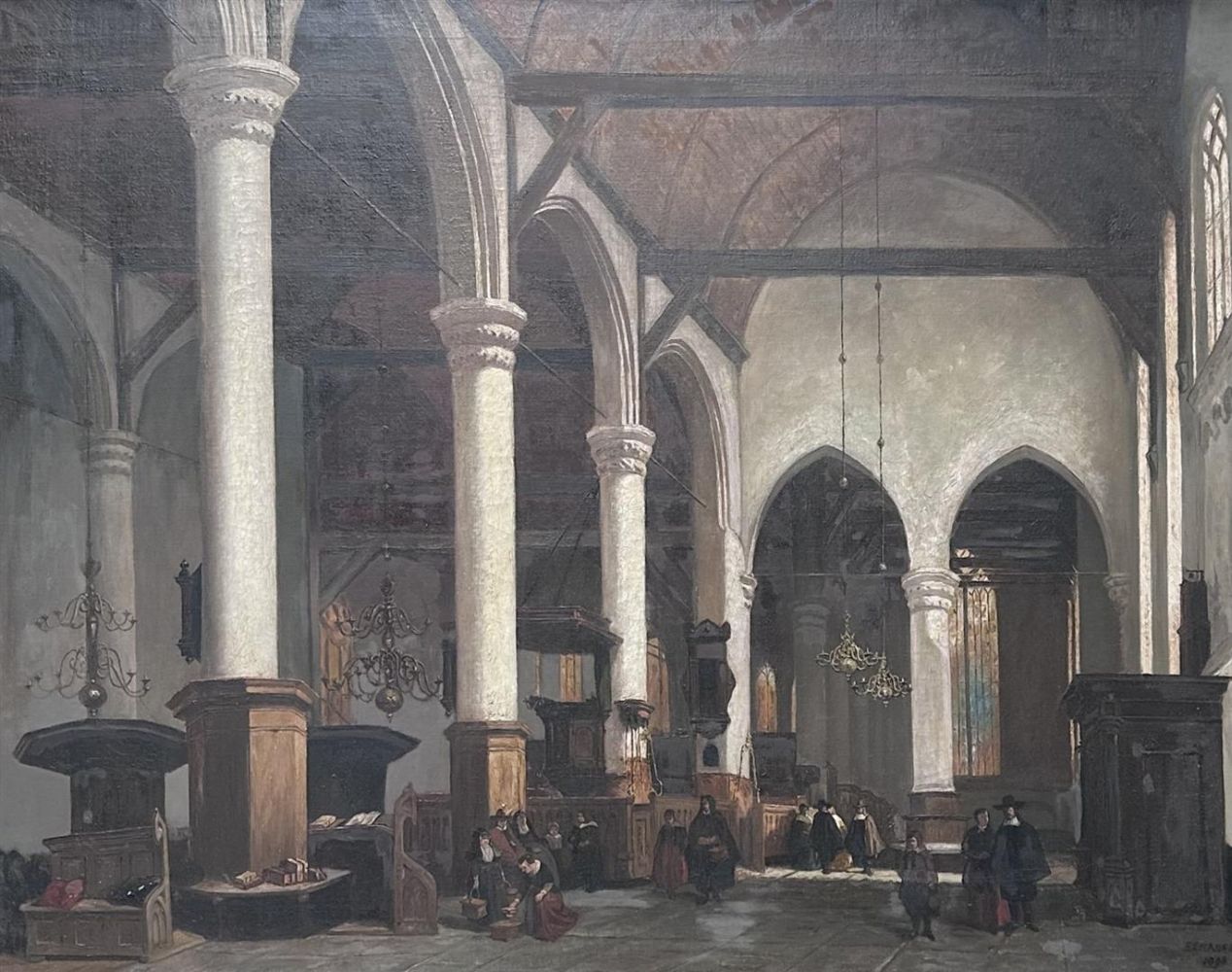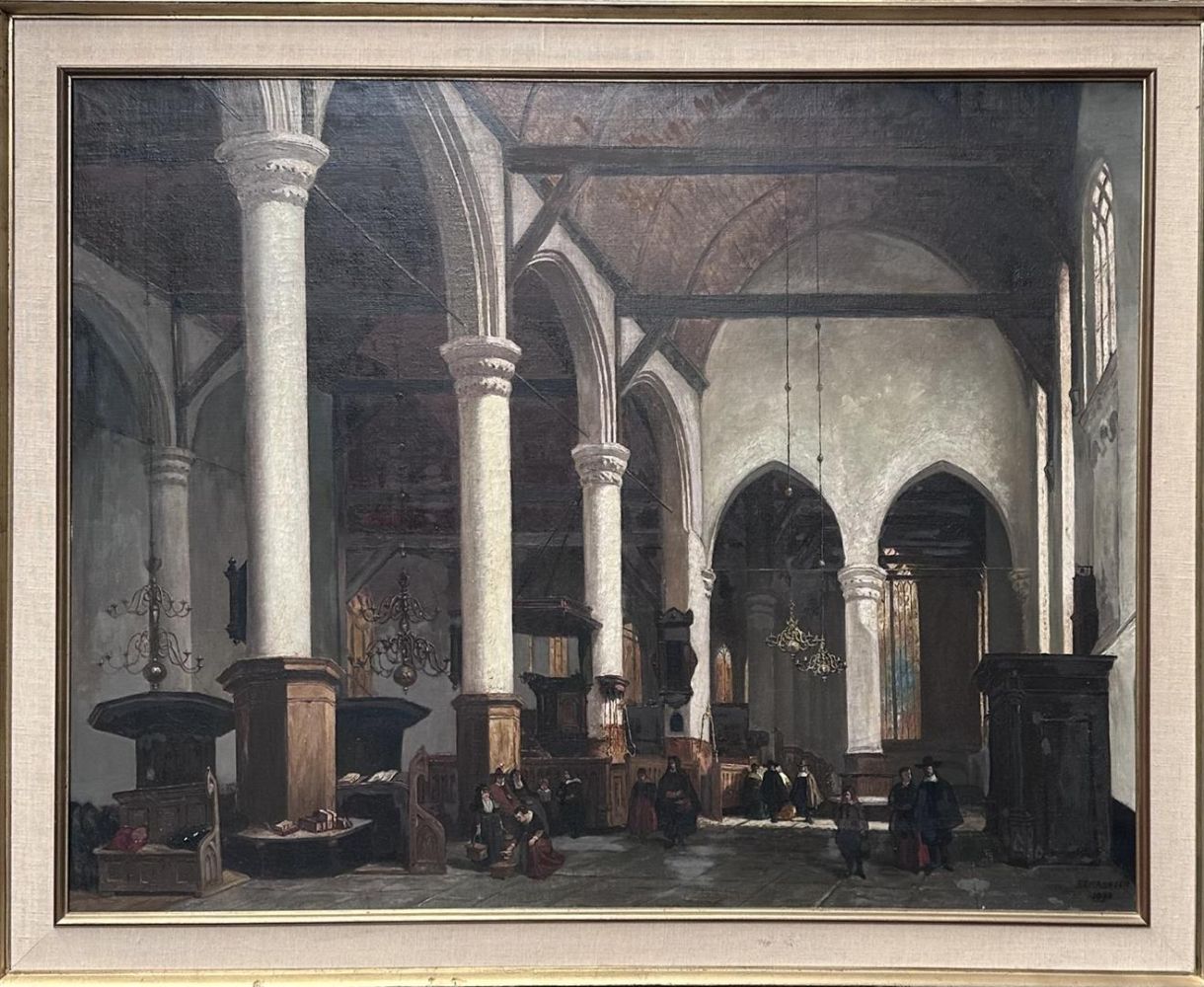 Church interior with many figures, signed indistinctly, and dated 1898 (bottom right), oil on canvas. 130 x 100 cm.