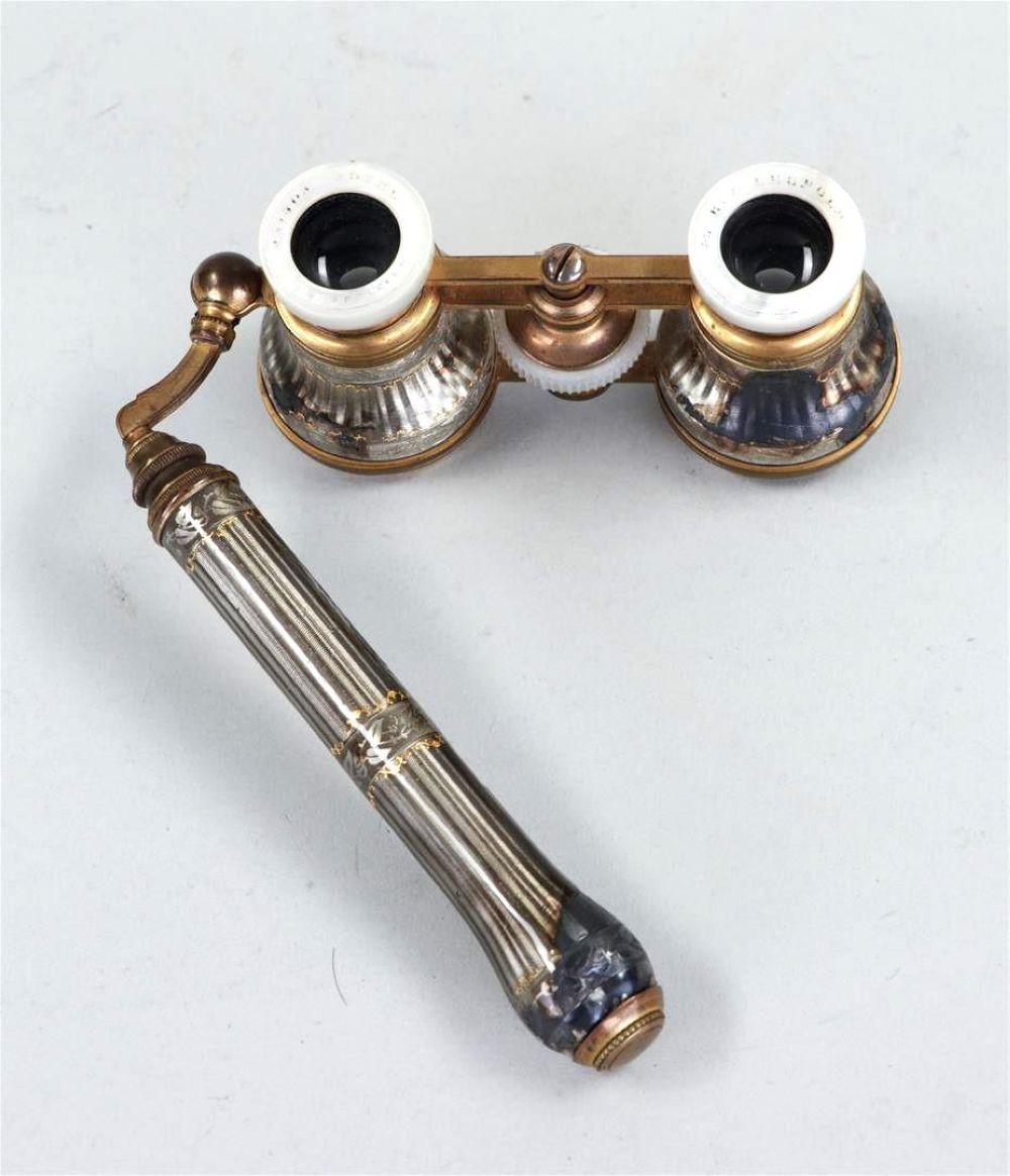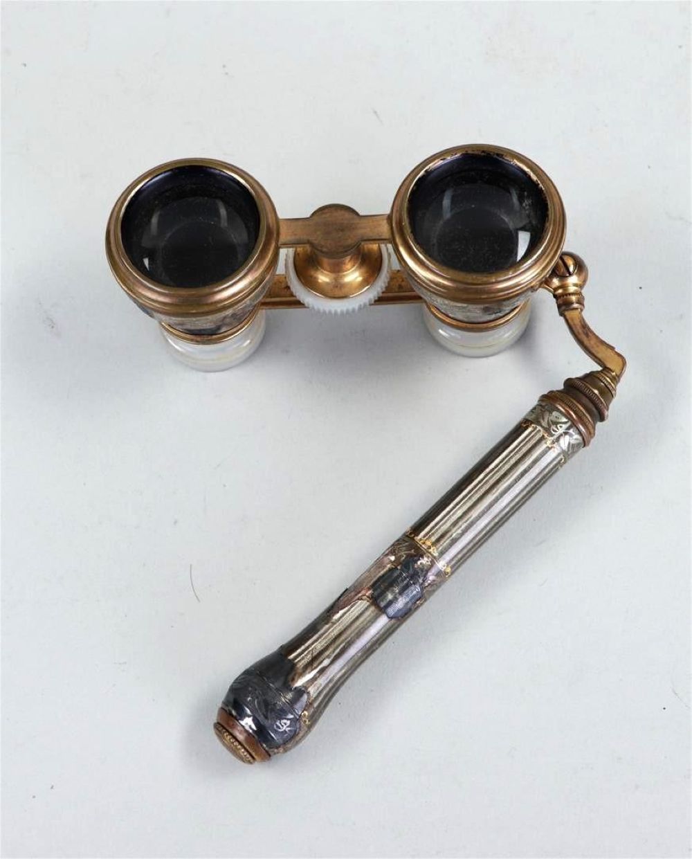 A pair of opera glasses in a cloth bag. ca. 1900/1920.