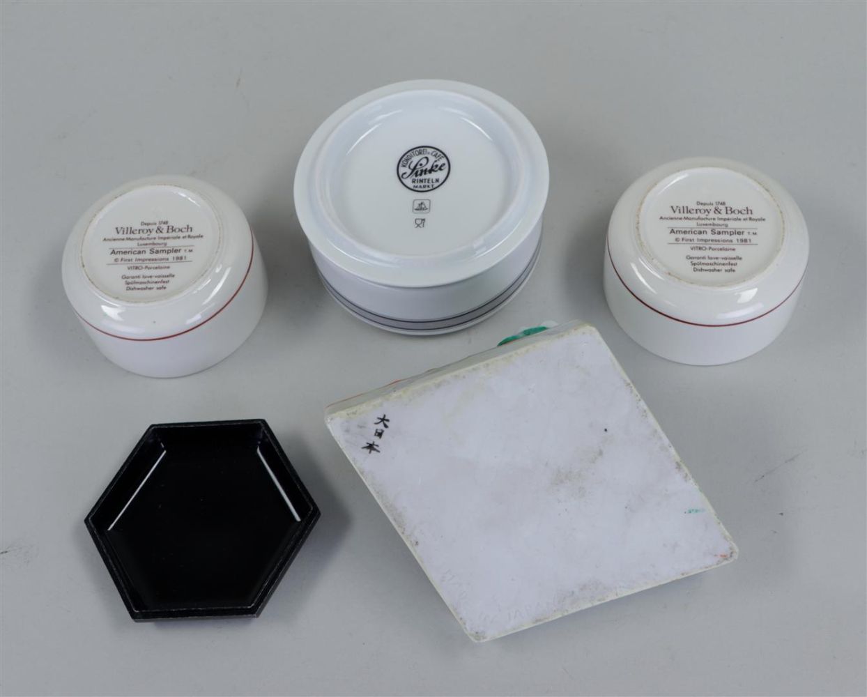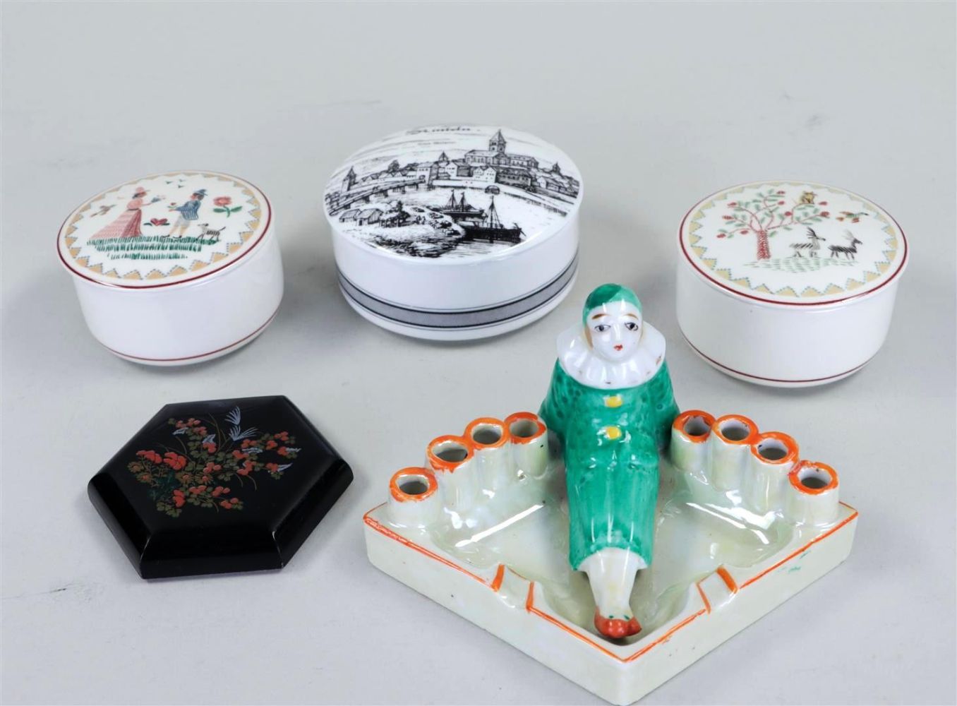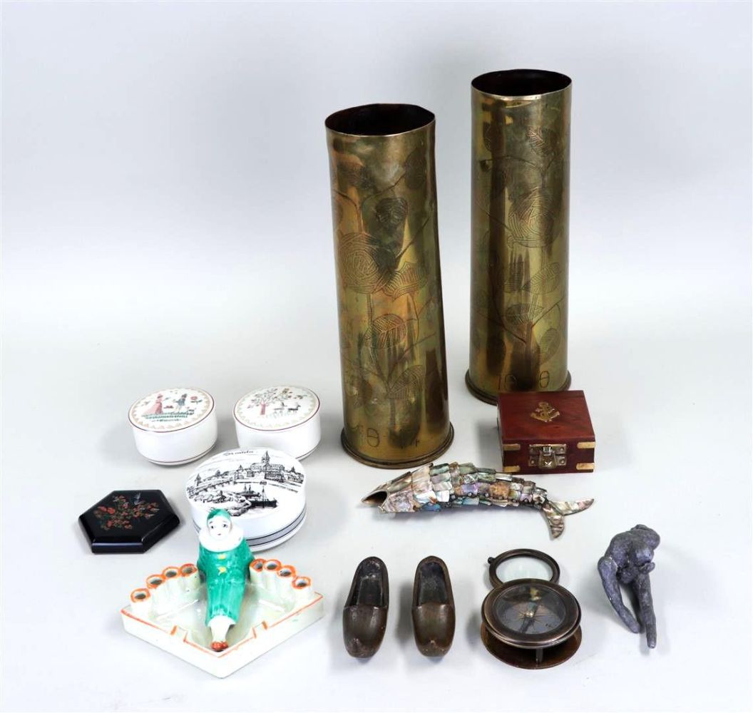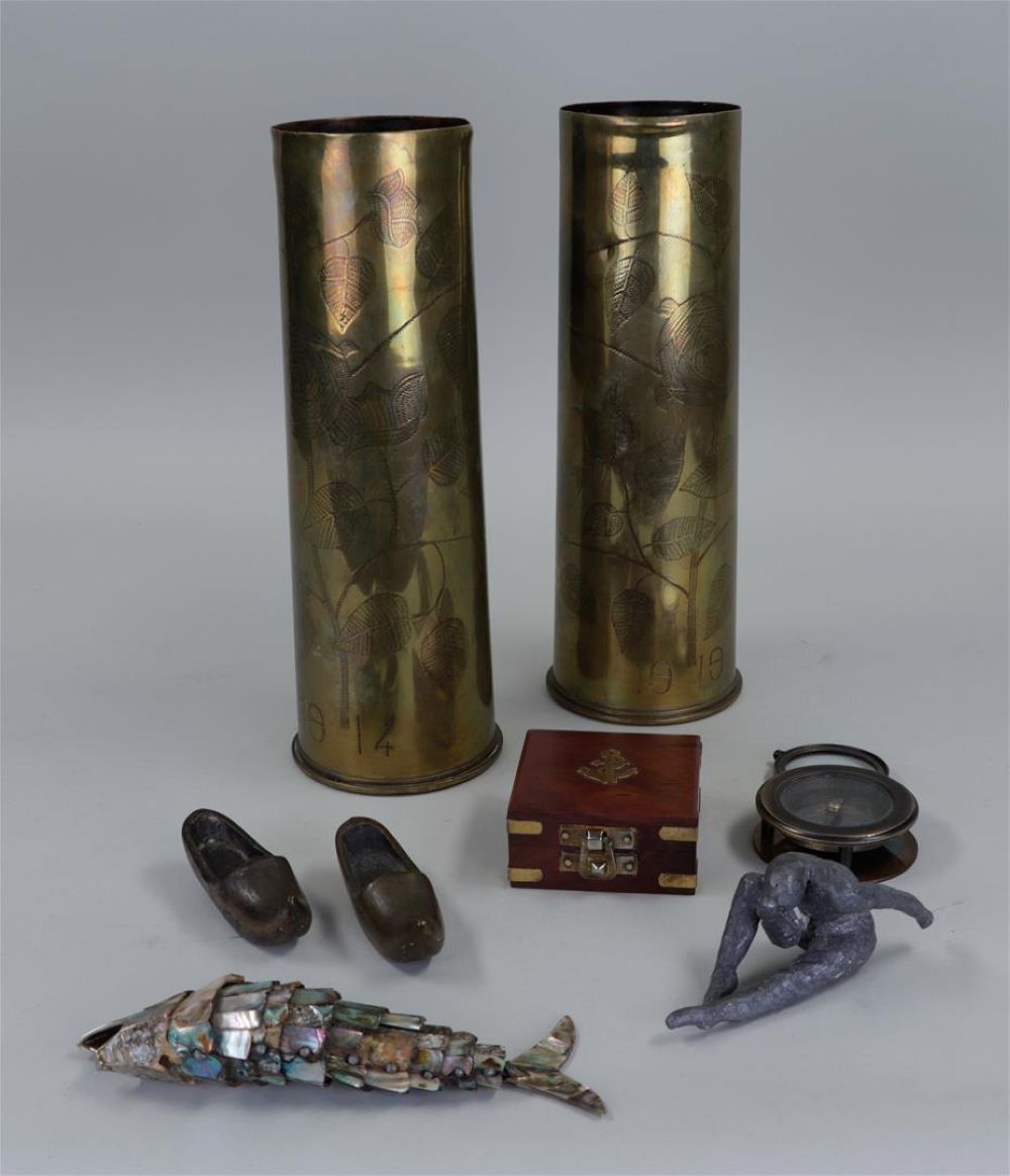 A miscellaneous lot consisting of two grenade shells, mother-of-pearl fish, compass, bronze figures and a porcelain ashtray.