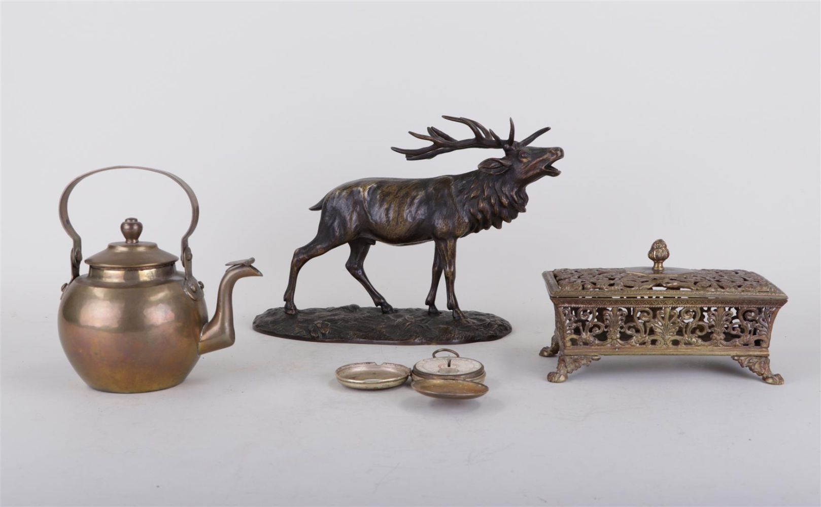 A miscellaneous lot consisting of a bronze deer, an open cast lid box, a...