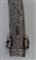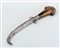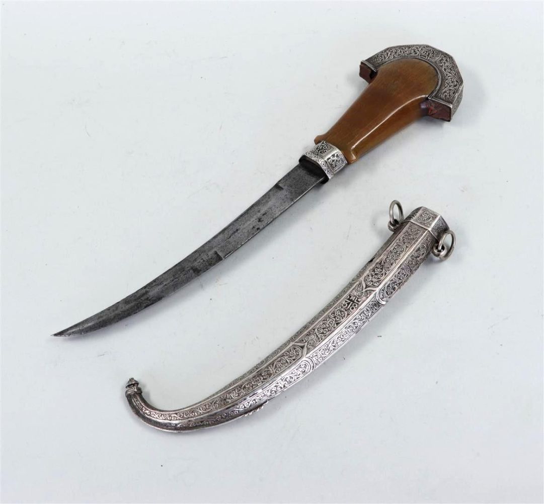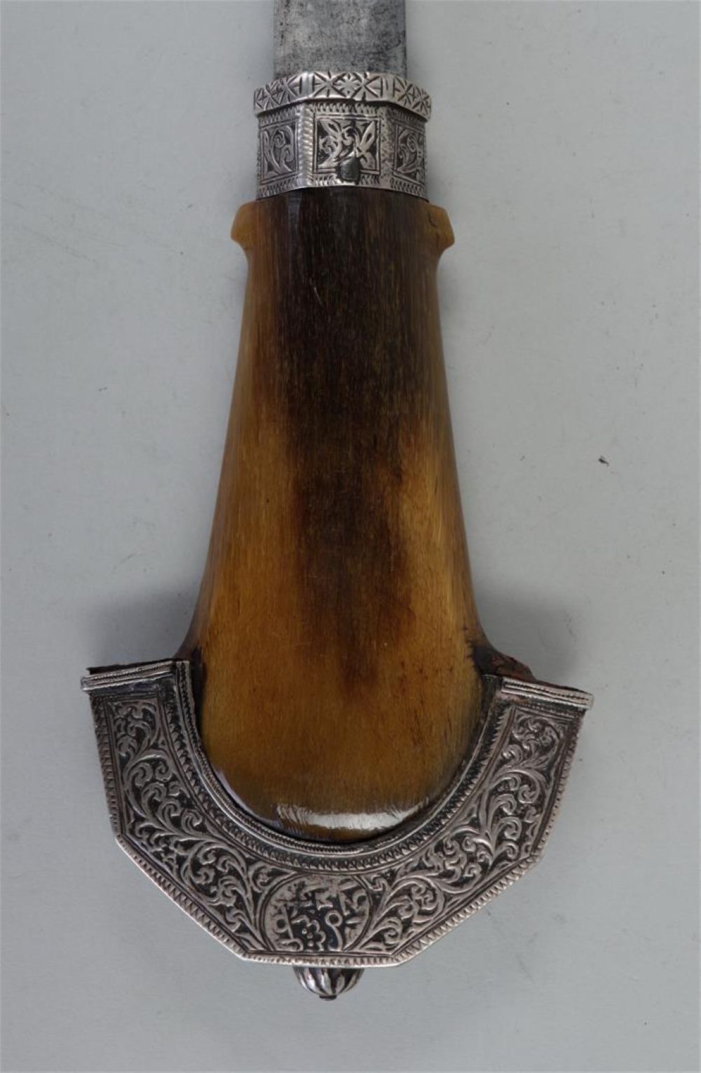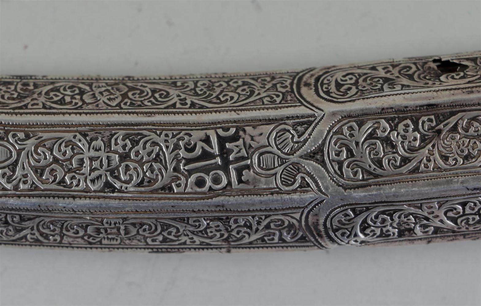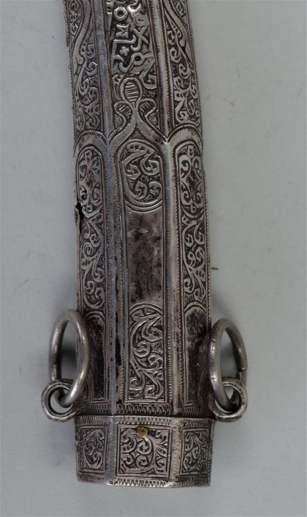 A 19th century silvered Moroccan koumiyya. Curved blade in the familiar double-edged shape. Original one-piece horn handle with chiselled silver sheath. Silver sheath of hexagonal section, chiselled all over with panels of meander flowers and inscribed on both sides.