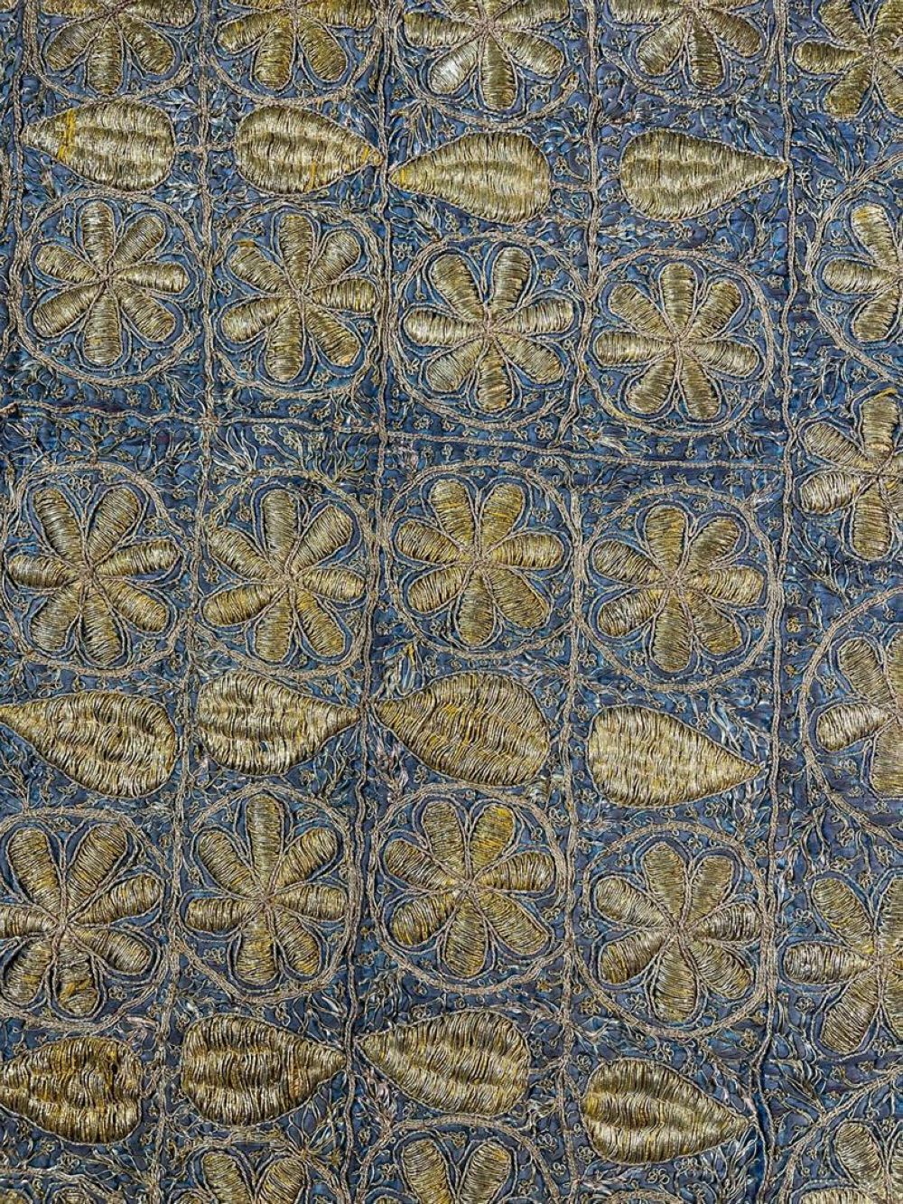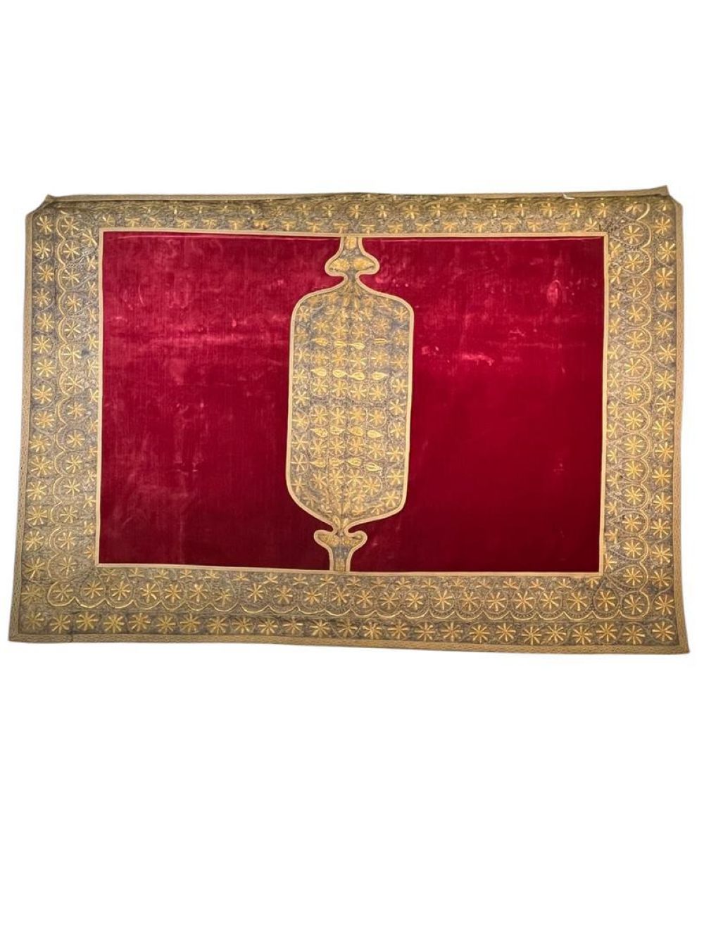 A beautifully embroidered tapestry with wrought iron rings. India.243 x 174 cm.