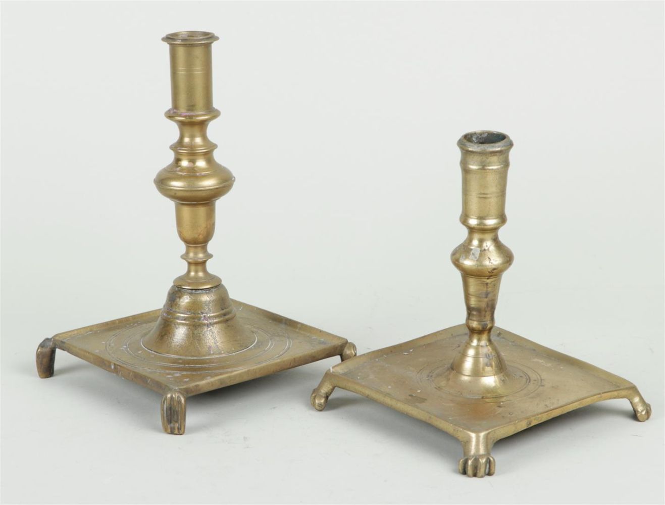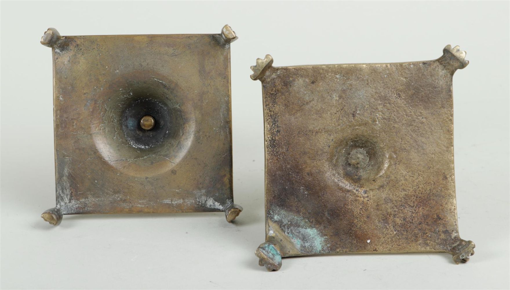 A lot of two Spanish brass candlesticks on a square base and legs, 17th/18th century.