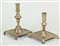 A lot of two Spanish brass candlesticks on a square base and legs, 17th/18th...