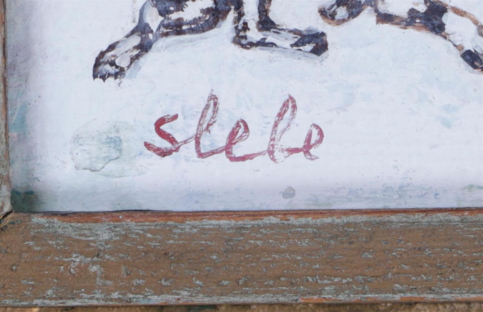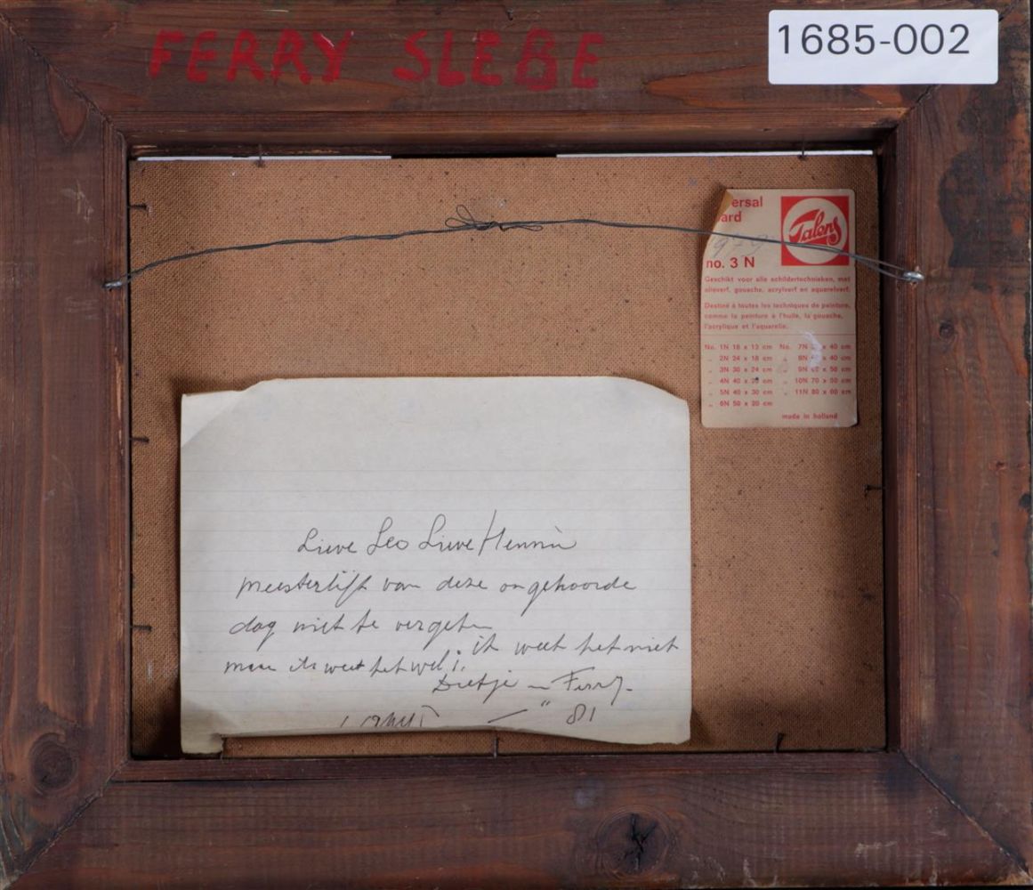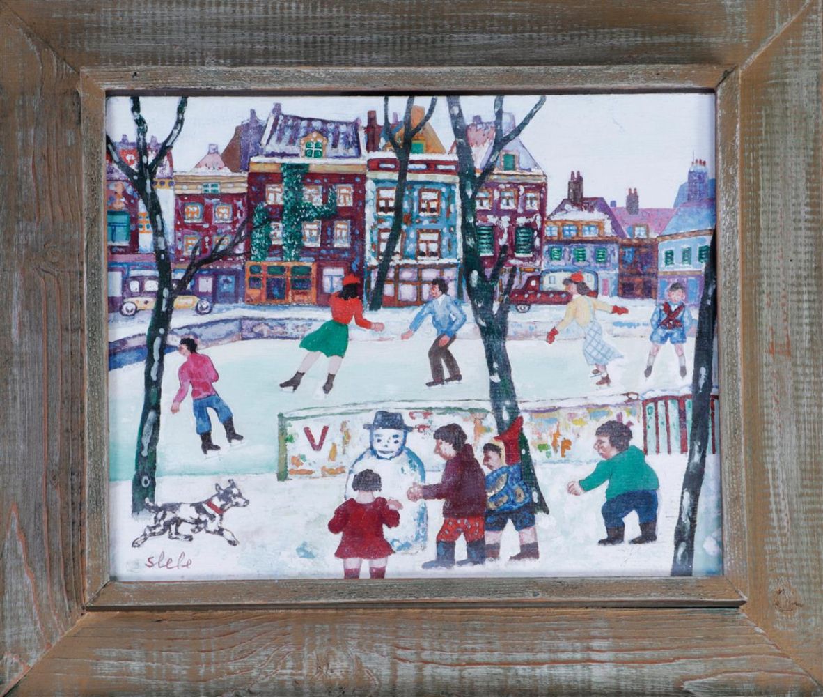 Ferry Slebe (1907-1994), Skaters on the canal, signed (lower left), and signed again, annotated and with dedication on a piece of paper (verso), oil on panel. Provenance: obtained directly from the artist by the parents of the current owner, then by inheritance.