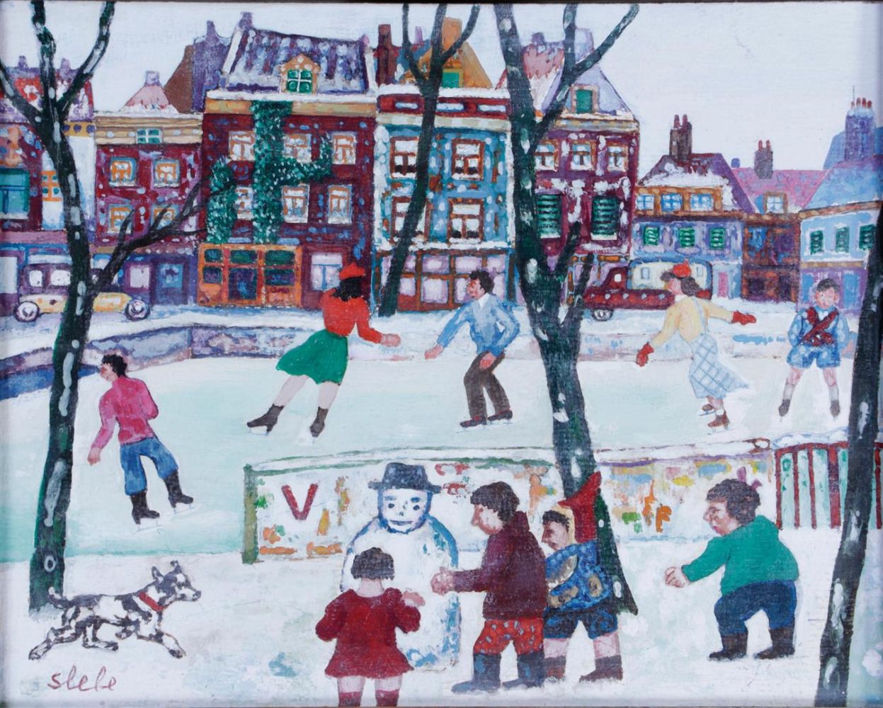 Ferry Slebe (1907-1994), Skaters on the canal, signed (lower left), and...