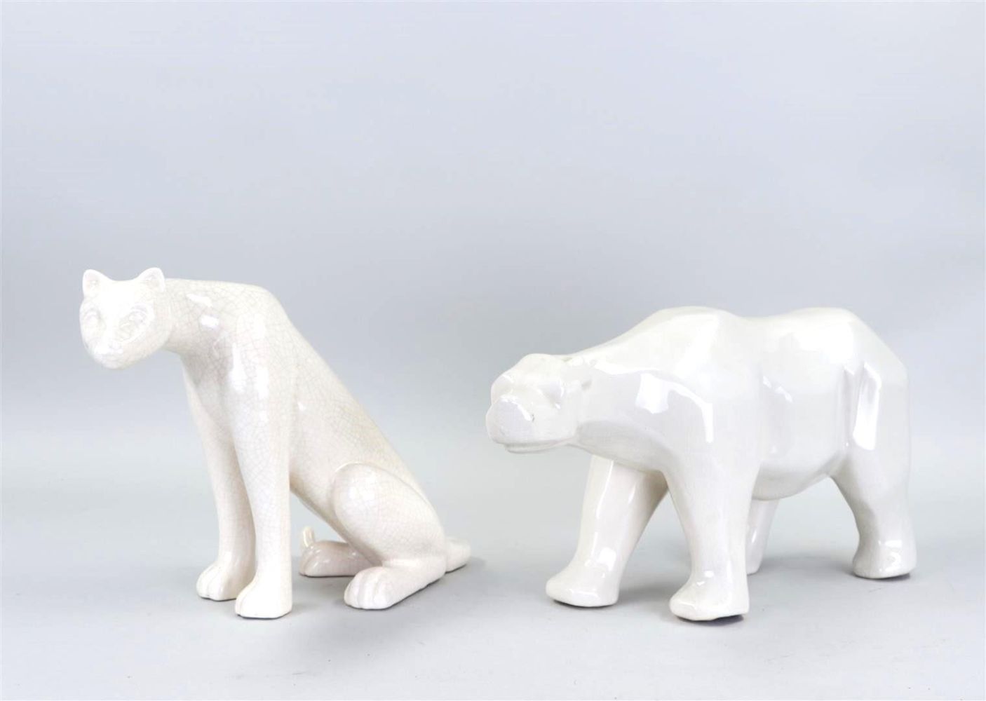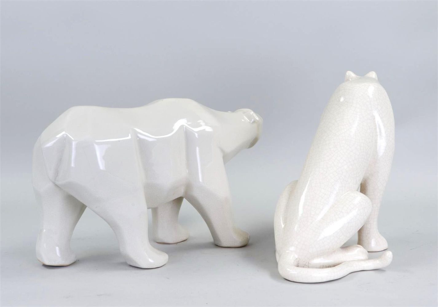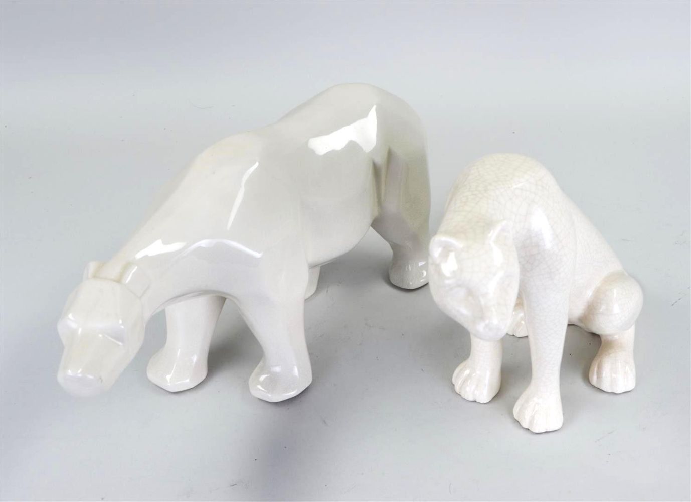 A lot consisting of (2) L & V Ceram shaped pieces representing a polar bear, and a panther. resp.: 21 x 40 cm., and 24 x 32 cm. ca. 1930.