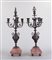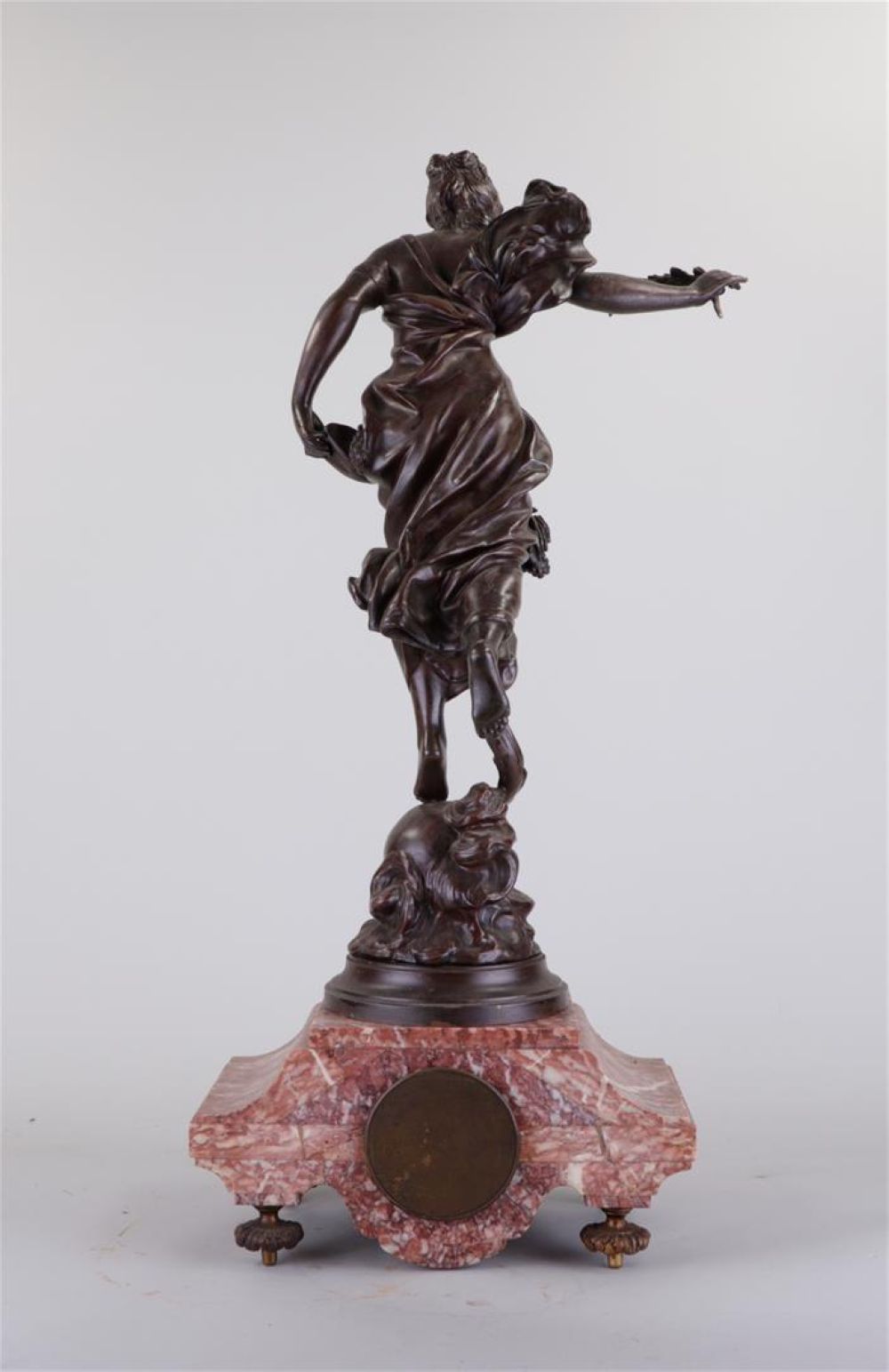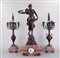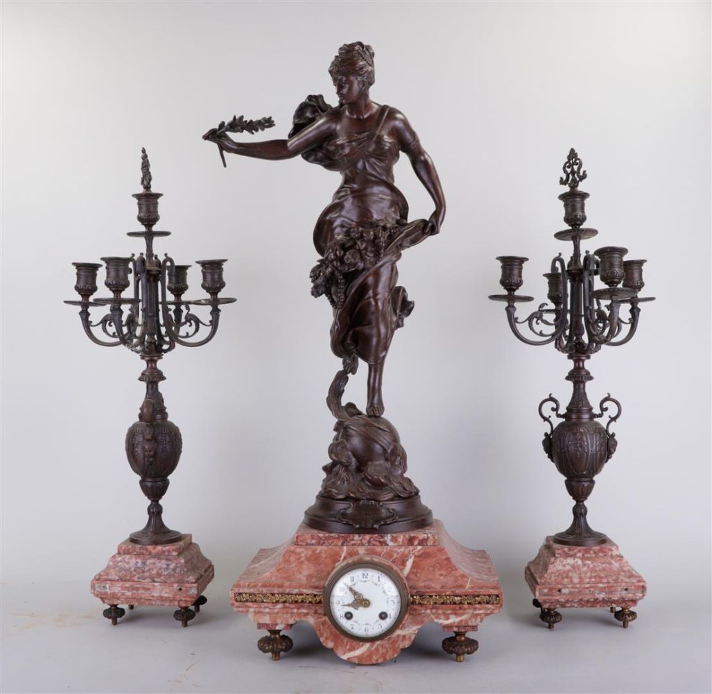 A mantel clock, with a bronze bell figure representing 'Paix et Aboundance' (peace and abundance), with two candlesticks, all on a sweetened marble base. ca. 1880. H.: