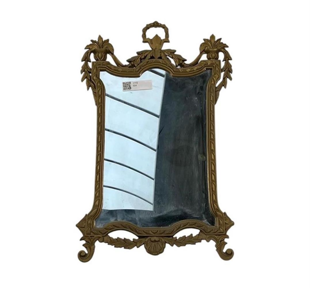 A bronzed, English, facet cut mirror.H. 74 x 44 cm.