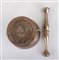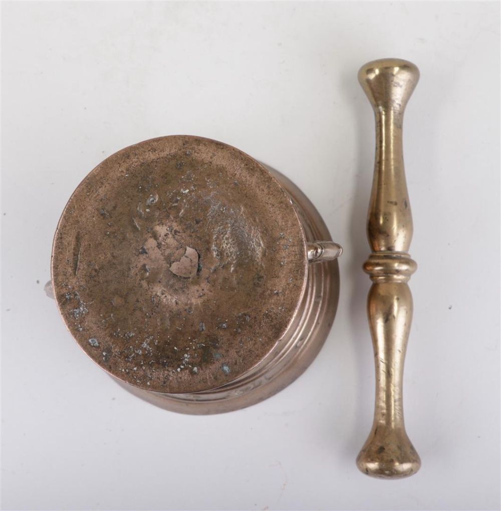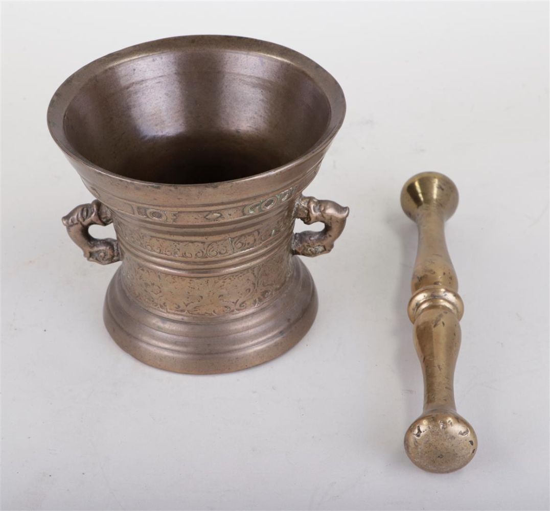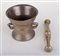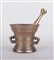 A bronze mortar and pestle, annotated all around. Height 12.5 x Diam. 14 cm.