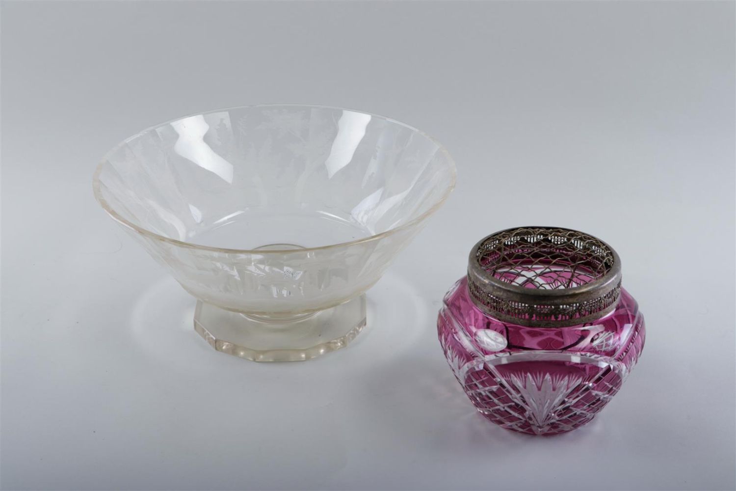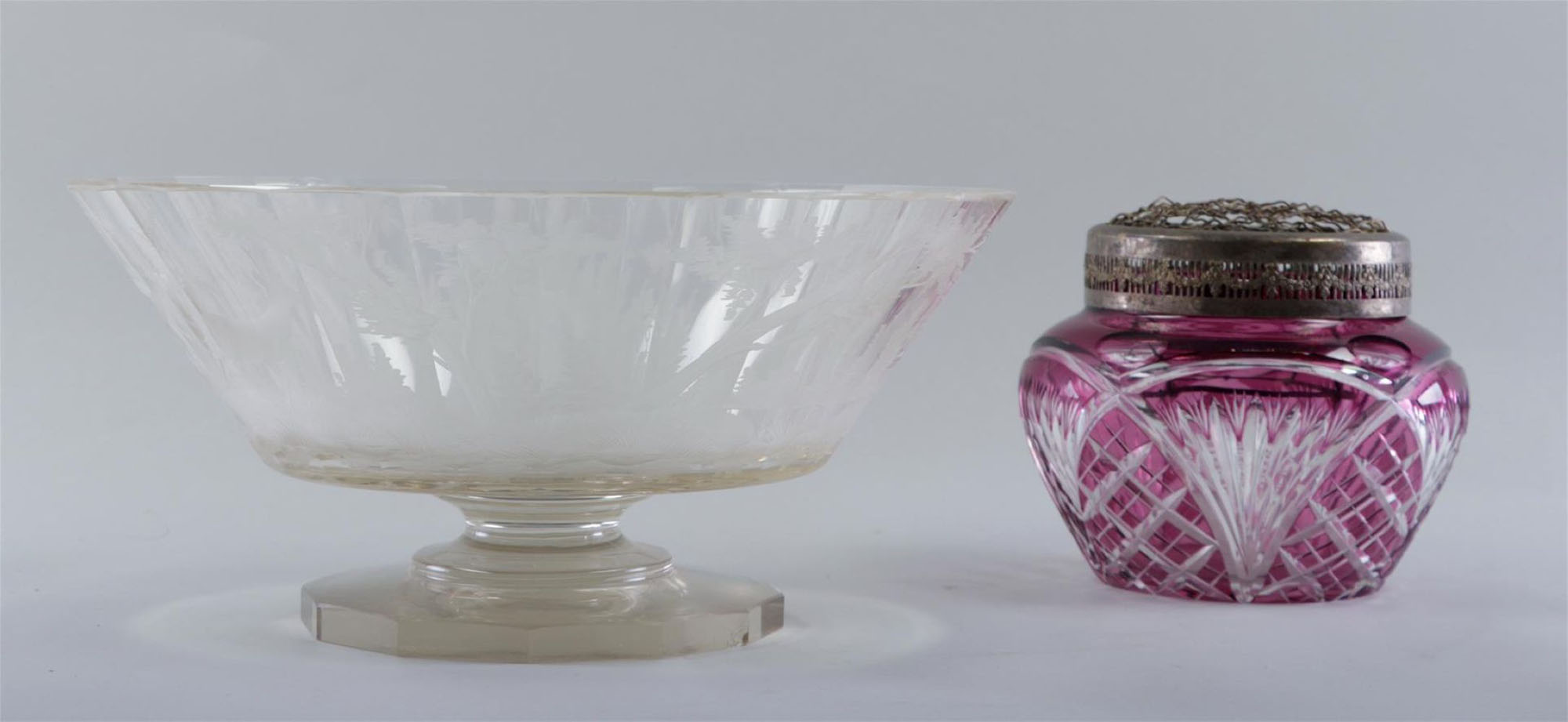 Two Bohemian crystal objects consisting of a bowl and a flower plug. Bowl has...