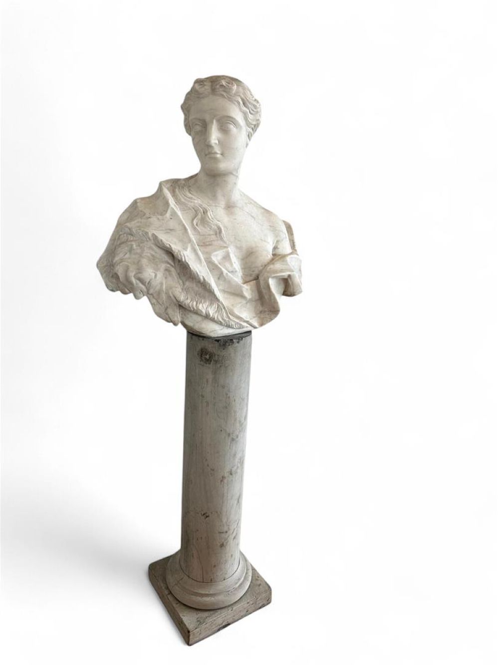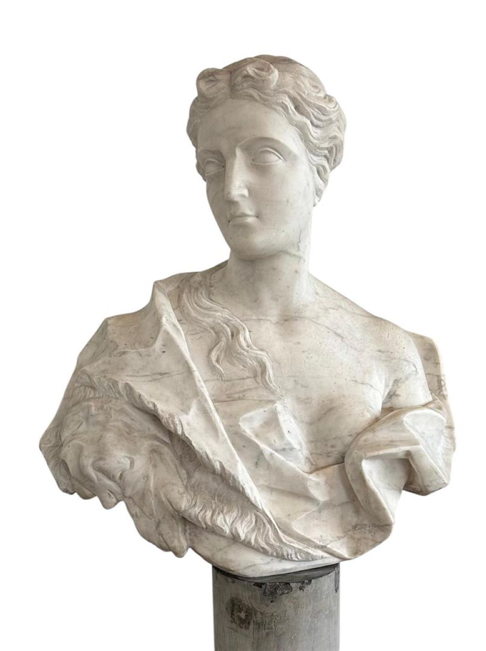 A large Carrara marble bust depicting Hera on a marble column.