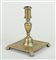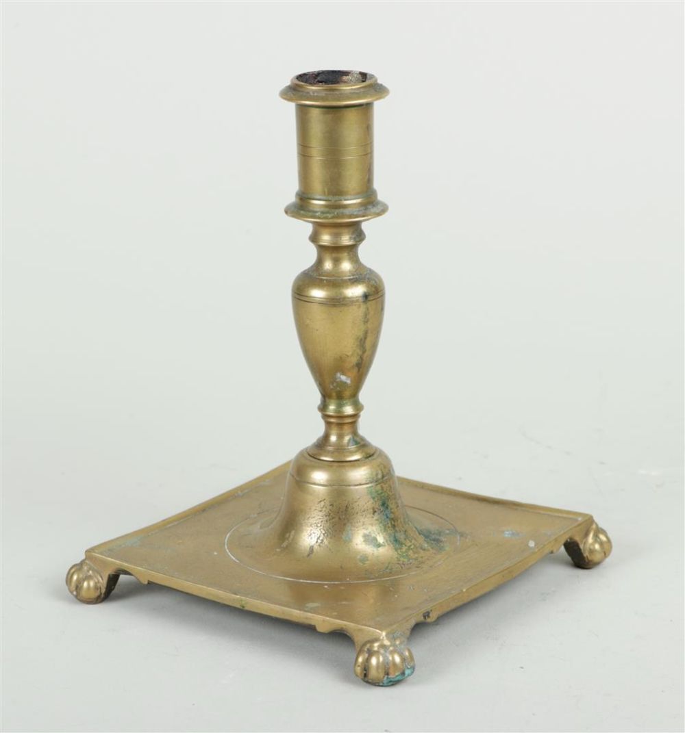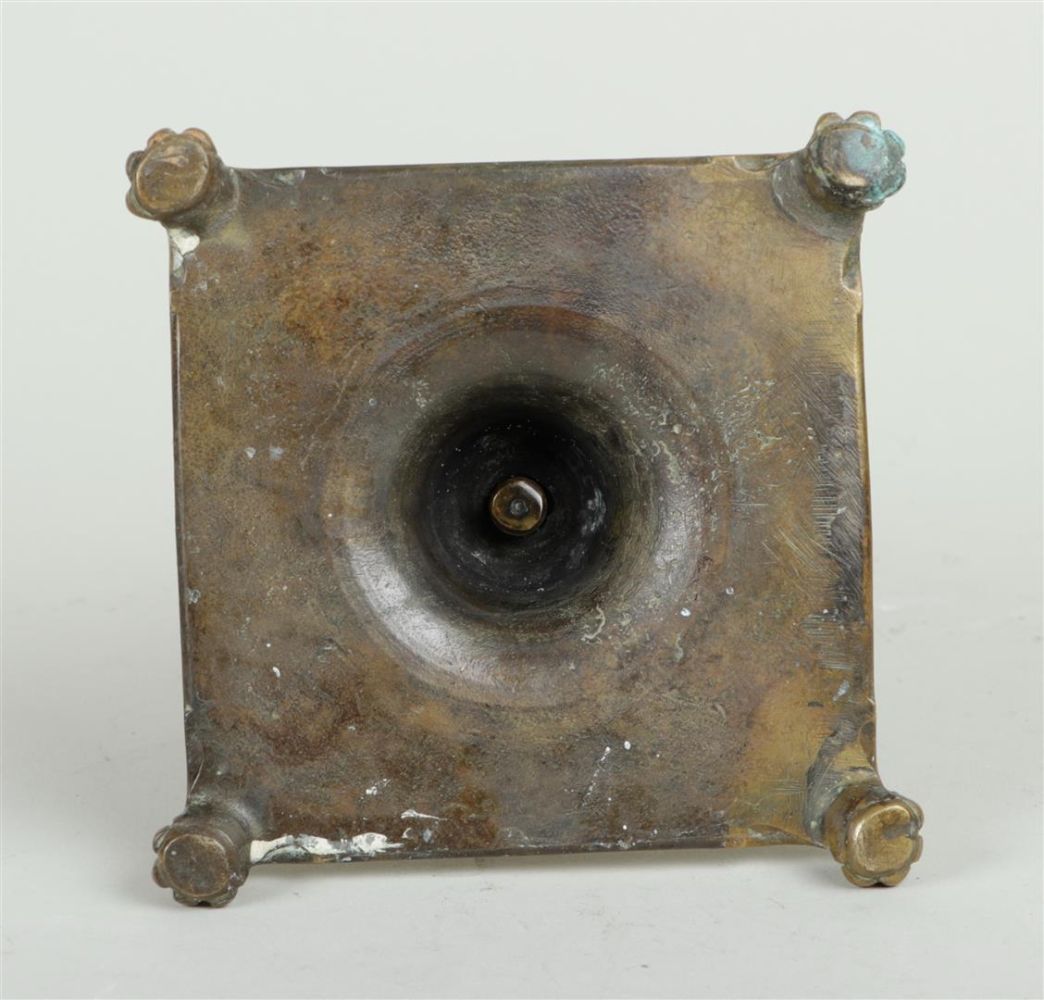 A Spanish brass candlestick on a square base and legs, 17th/18th century.H....