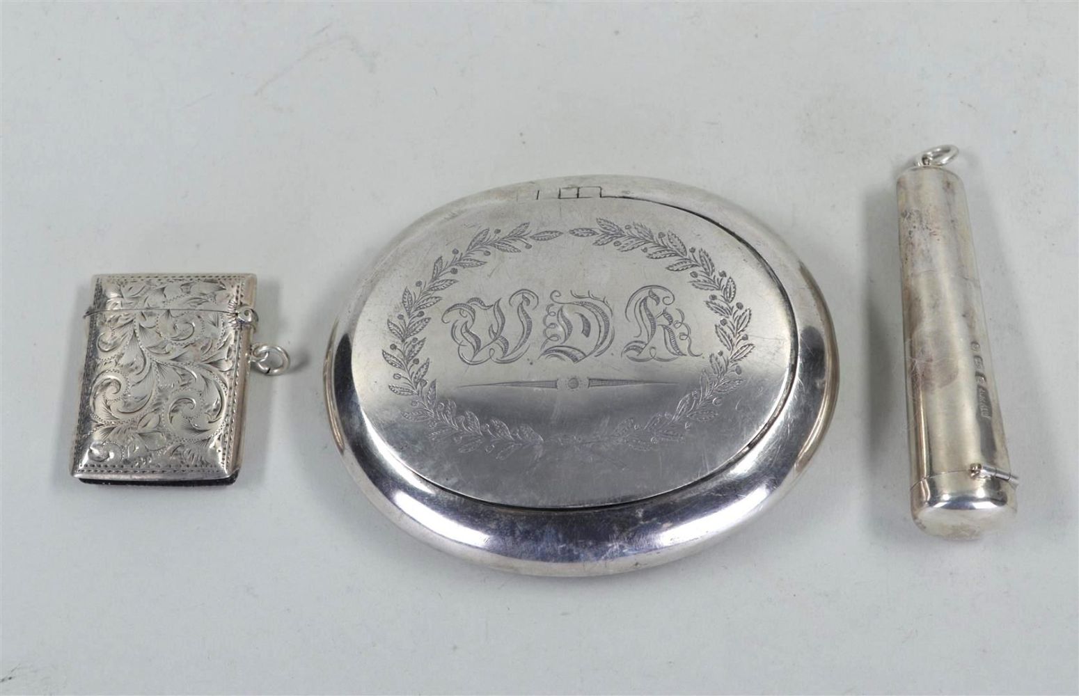 A lot consisting of a silver tobacco box, a silver tinder box and a tube....