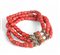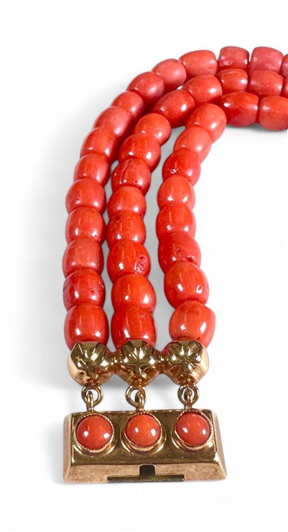 14kt yellow gold bracelet set with blood coral. The bracelet has a beautiful scalloped sliding clasp with safety chain, the clasp is set with an oval cut cabochon cut blood coral of approx. 4 mm and 3 strung strands of blood coral (barrel-shaped, approx. 5.5 mm - 6.5 mm x approx. 5.5 x 6.5 mm.)
