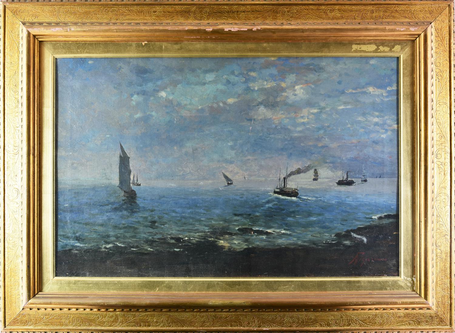 Andrea Figari, (1858 - 1945) MARINA CON BARCHE E VAPORETTO olio su tela, cm...