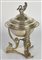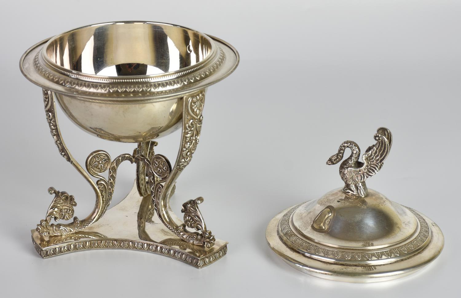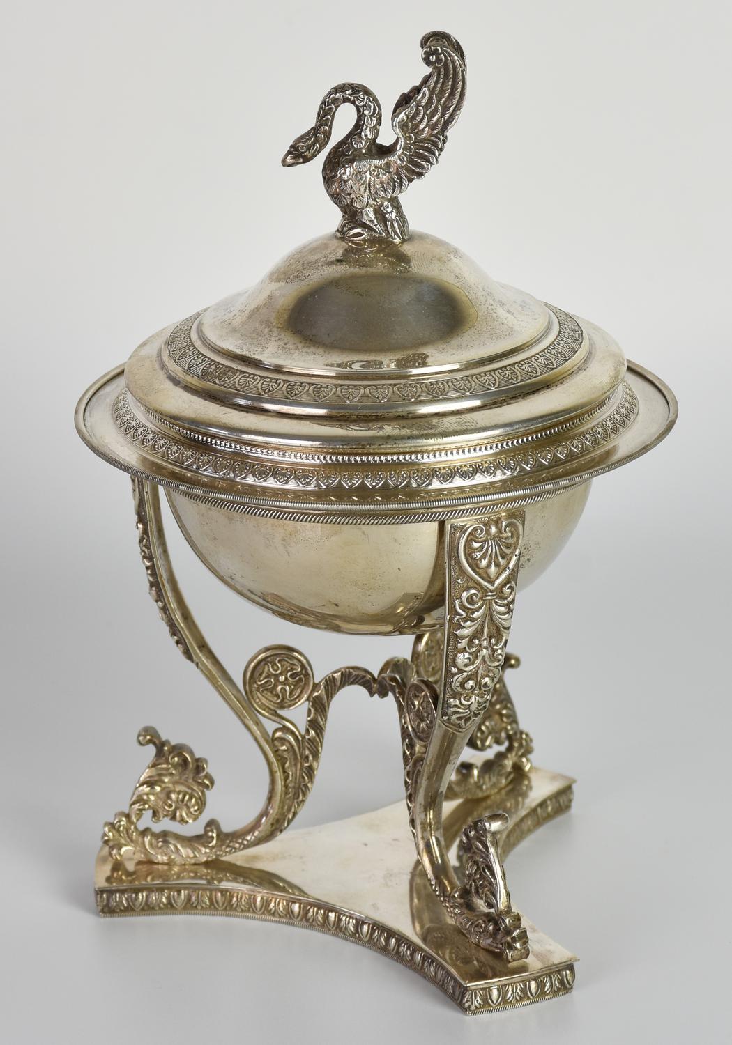 argento 800/1000, lavorazione a sbalzo e cesello, piede triangolare con sostegno a tripode impreziosito da motivi neoclassici a volute; presa del coperchio configurata a cigno con ali aperte