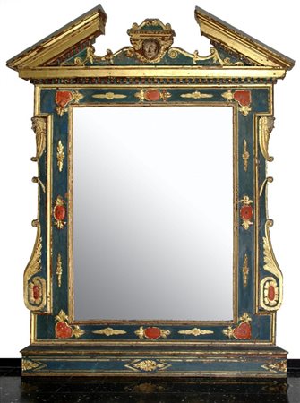 legno di noce intagliato, laccato e dorato con foglia oro zecchino, struttura a timpano