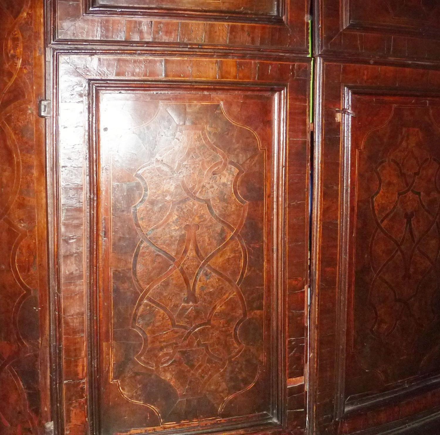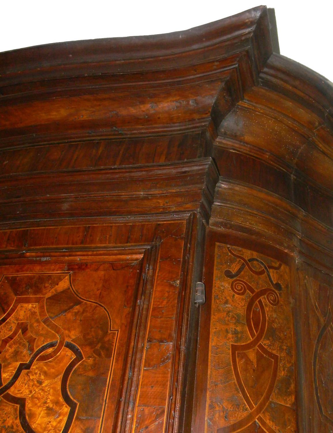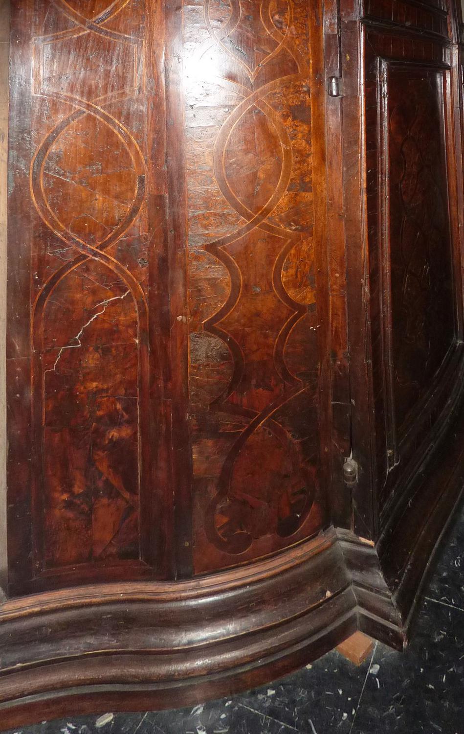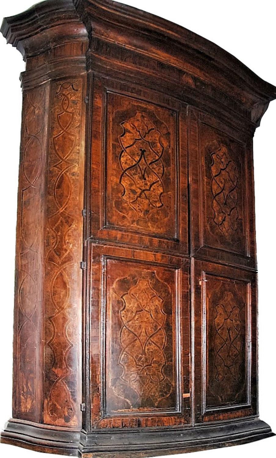 lastronata in radica di noce con profili e sagome in legno ebanizzato, mossa sui fianchi e sul fronte suddiviso in quattro ante, cimasa agettante, serratura e cerniere coeve