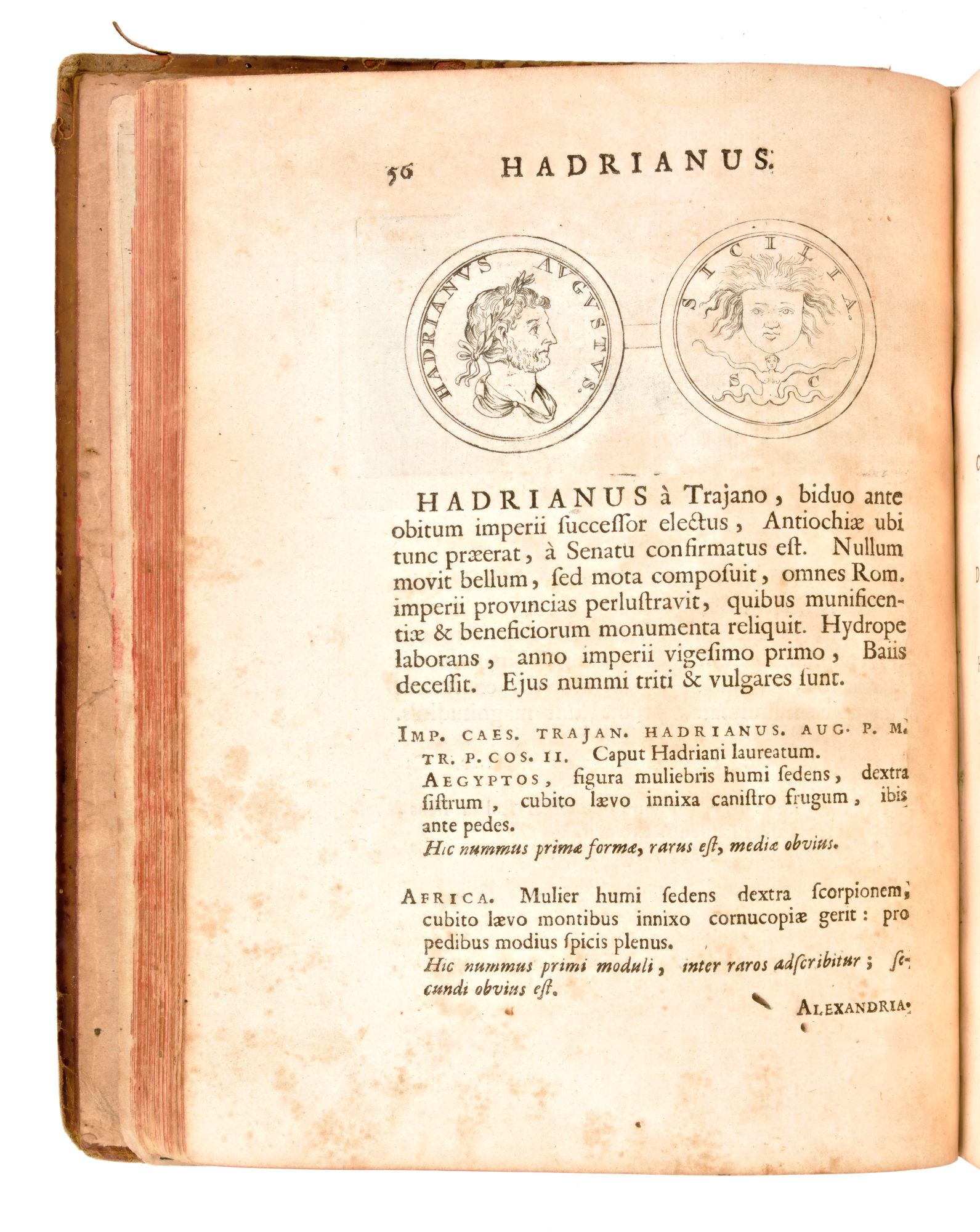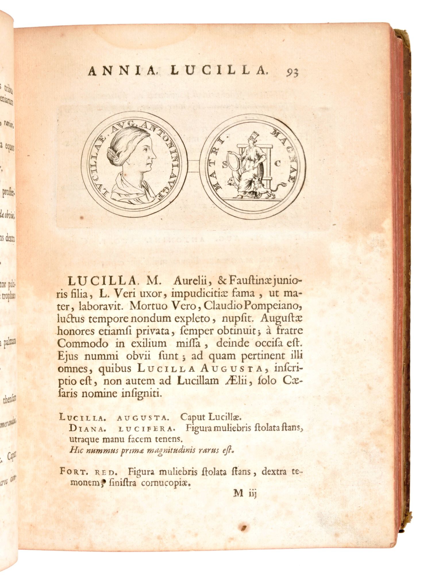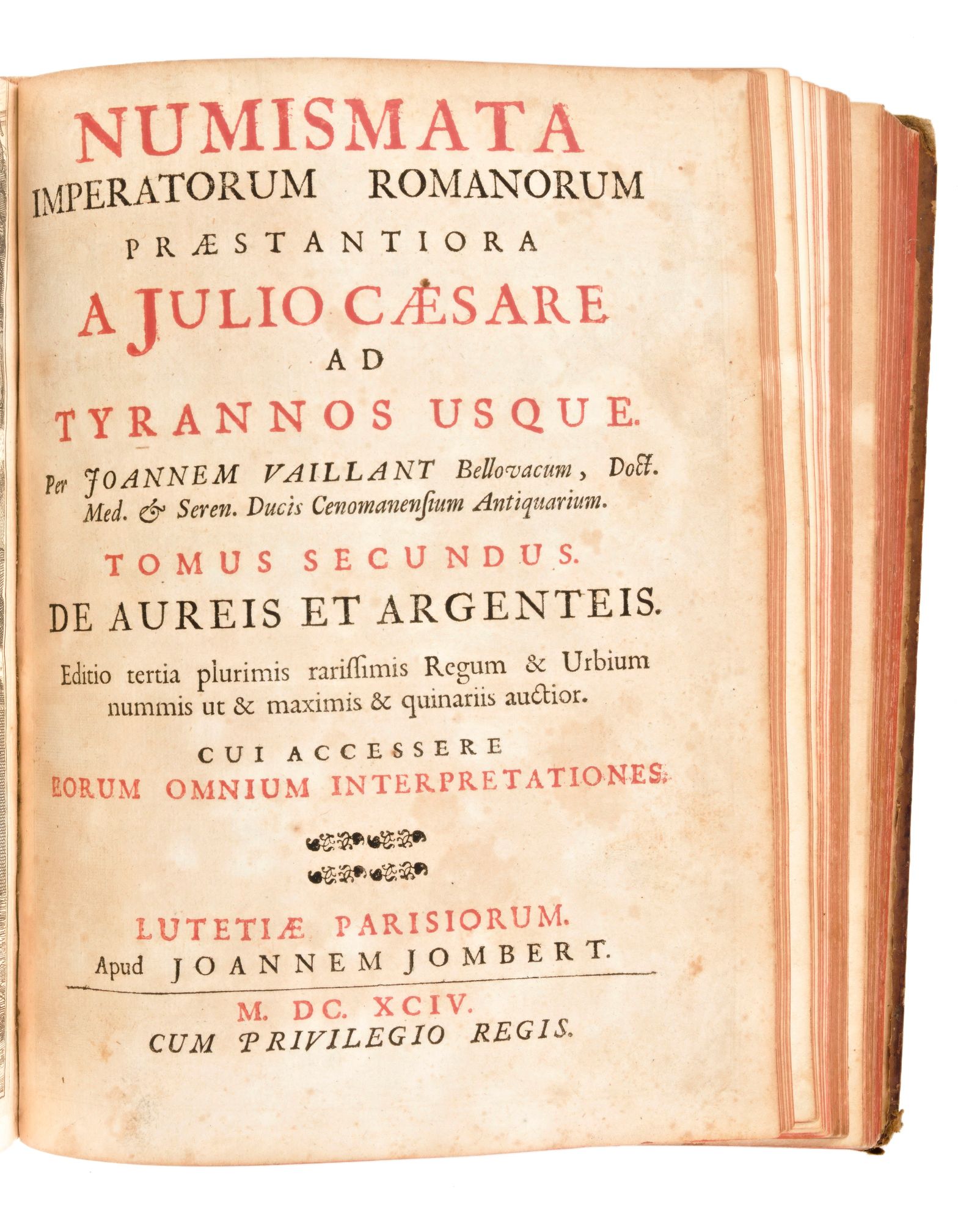 Antica edizione impressa in Parigi il 1694 (Prima ed. 1671), in 2 parti rilegate in un unico volume. Opera del numismatico francese Jean Foy Vaillant (1632-1706). Numerose monete romane incise in calcografia nel testo raffiguranti Giulio Cesare e i vari imperatori romani. Frontespizi stampati in rosso e nero. Capilettera e finalini xilografici.