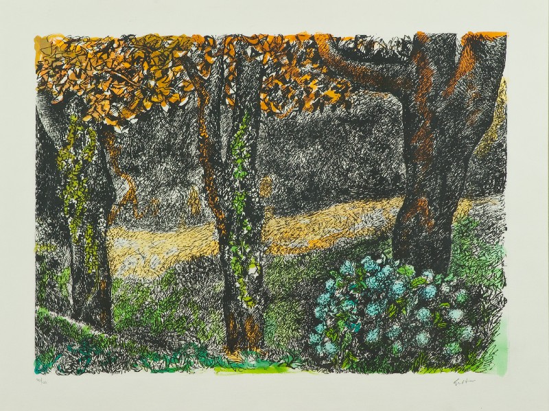 Renato Guttuso (Bagheria (Pa) 1912 - Roma 1987) BOSCO Acquaforte e acquatinta ritoccata a mano di cm. 54,5x75, su carta di cm. 70x90, es. 90/100 Firma in basso a destra, tiratura in basso a sinistra.