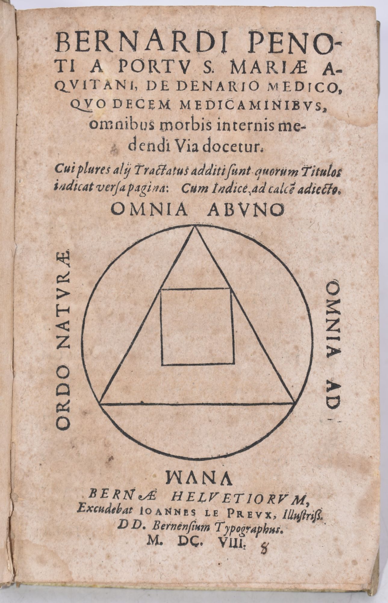 Penot, Bernard Georges : BERNARDI PENOTI A PORTU S. MARIAE AQUITANI, DE DENARIO MEDICO, QUO DECEM MEDICAMINIBUS, OMNIBUS MORBIS INTERNIS MEDENDI VIA DOCETUR. … Bernae Helveticorum, 1608, excudebat Ioannes Le Preux.