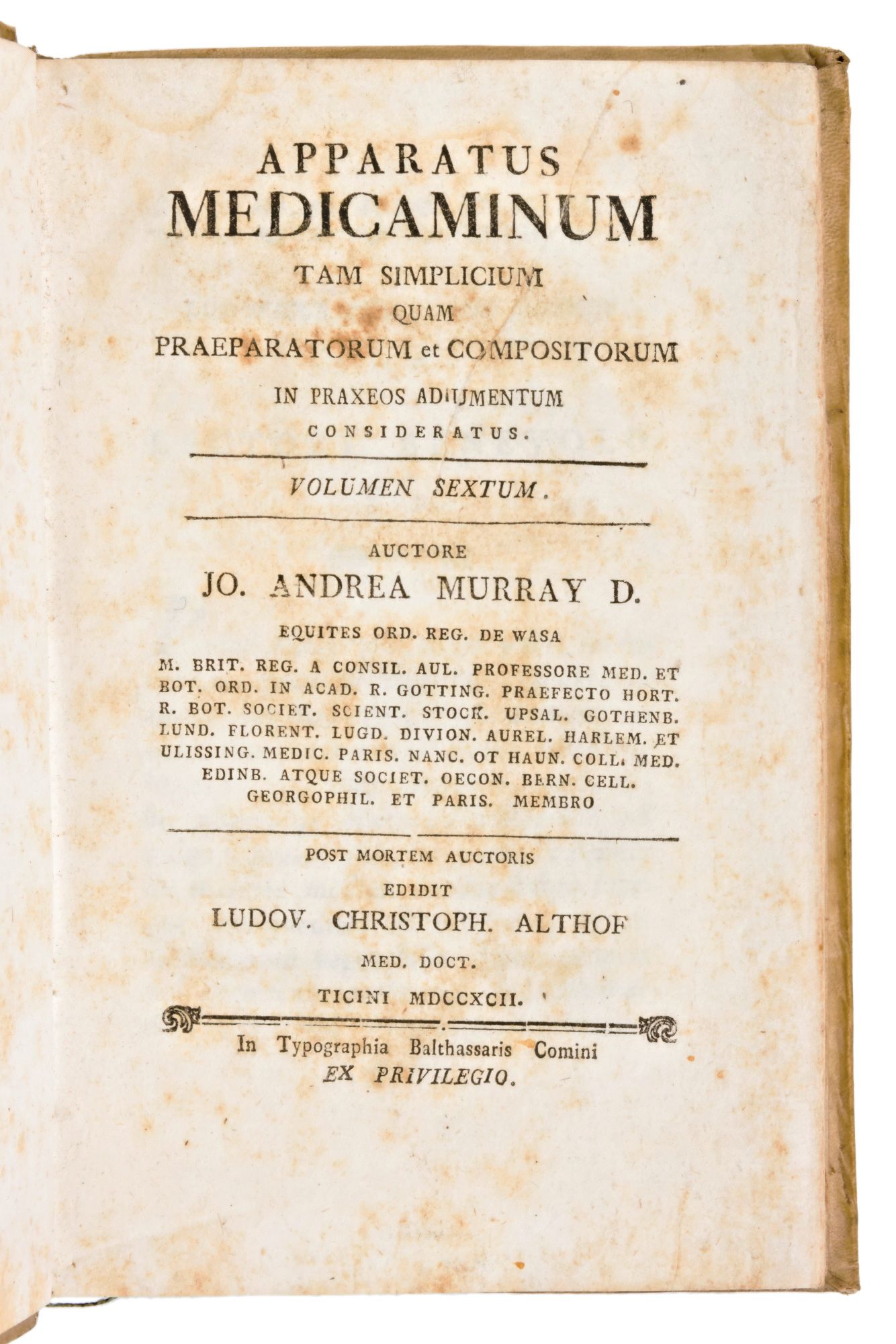 5 volumi in-8°, mm. 205x135, pp. XXII, 515, (1) / 426 / 471, (1) / 437, (3) / 268. Marca tipografica al front. Testatine con vignete xilogr. nel testo. Legature coeve in piena pergamena con titoli in oro al dorso. Lievi fioriture alle carte, bruniture in alcune carte al tomo quinto. Testo latino. Prima edizione impressa tra il 1787 e 1792 del noto ricettario farmaceutico compilato dal medico e botanico svedese Johan Anders Murray (1740-1791). 5 di 6 volumi (manca il volume 2), Murray fu un importante farmacologo e botanico, questa opera Apparatus medicaminum (1776–92) in sei volumi, di cui l'ultimo fu pubblicato solo dopo la sua morte, è una raccolta completa di rimedi erboristici, con numerose ricette farmaceutiche per la preparazione di farmaci vegetali.