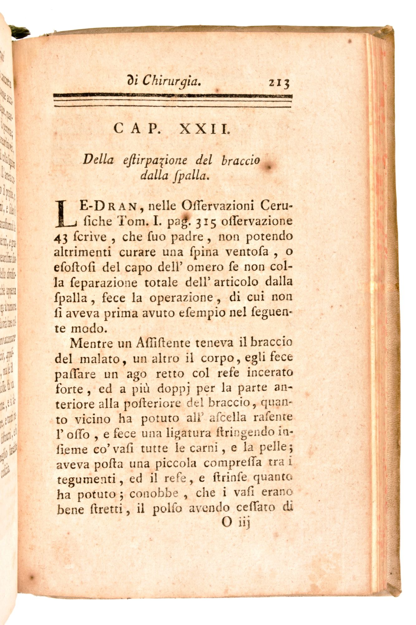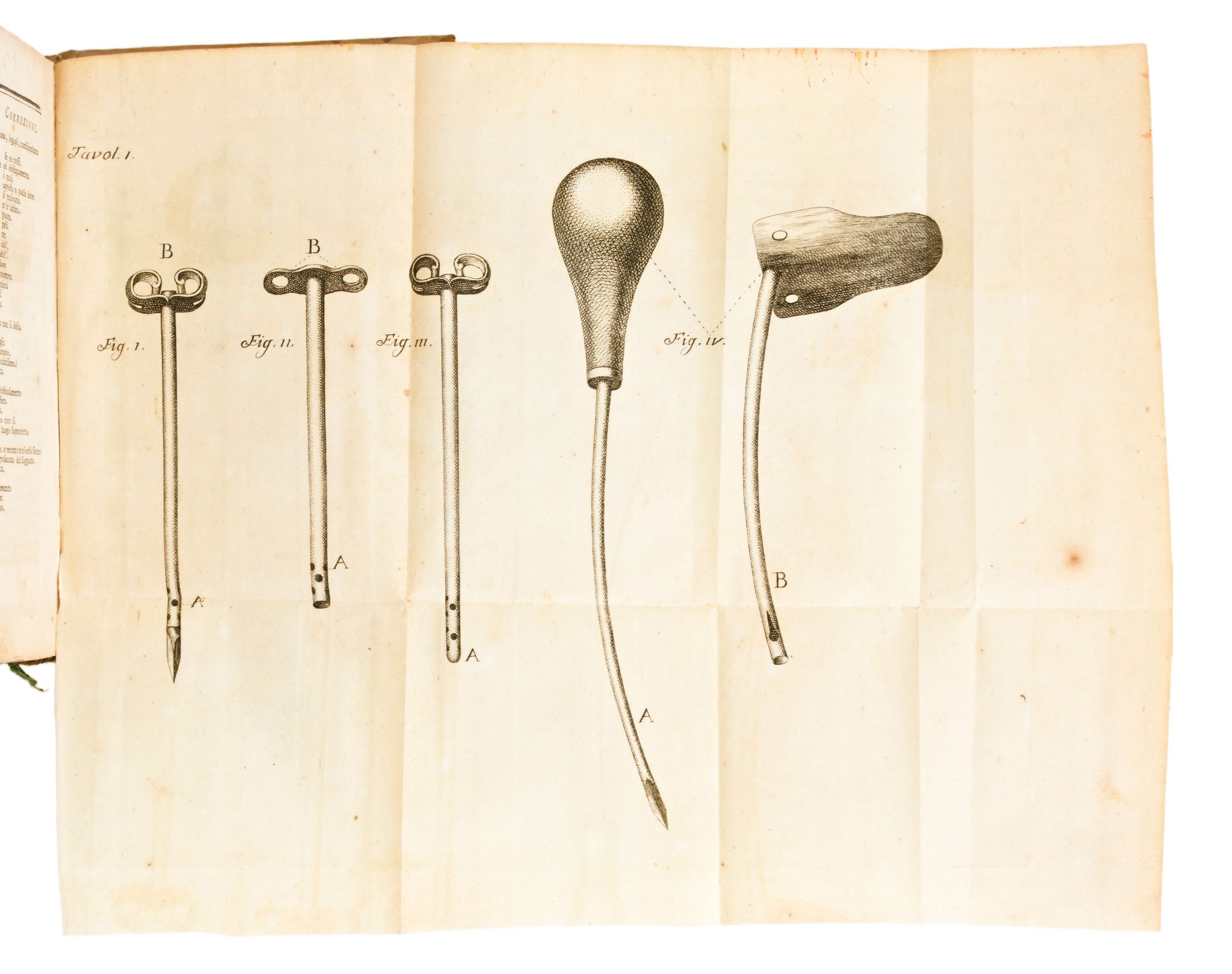 Bertrandi, Giovanni Ambrogio: Trattato delle operazioni di chirurgia Tomo 1-2... In Nizza il 1770. Formato in-8, pp. (10), LIV, (2), 264 + 4 c. di tav. ripieg. / (4), 352. Completo. Legatura coeva in piena pergamena con titoli in oro al dorso. Ottimo esemplare con minimi difetti, lievi fioriture e bruniture. Completa in 2 volumi. In fine al vol. 1, 4 tavole ripiegabili raffiguranti attrezzature mediche.