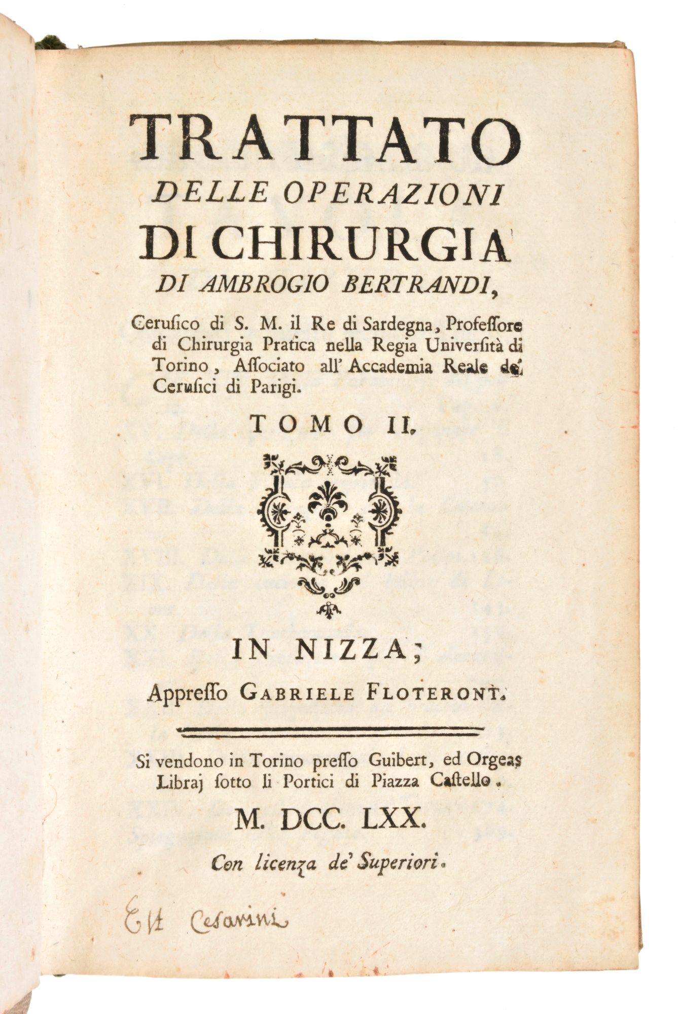 [Medicina-Chirurgia] Lotto di 2 opere : Bertrandi, Giovanni Ambrogio: Trattato delle operazioni di chirurgia Tomo 1-2... In Nizza il 1770 & Boyer, Alexis : Trattato delle malattie chirurgiche e delle operazioni convenienti... Firenze, 1842.