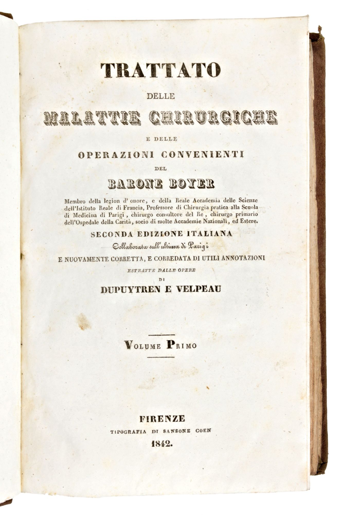 - Boyer, Alexis : Trattato delle malattie chirurgiche e delle operazioni convenienti... Firenze : Tipografia di Sansone Coen 1842. Formato in-4°, mm. 230x150, pp. 455 + 567, 8 carte di tavole in fine. Rilegatura coeva in piena tela con titoli e fregi in oro al dorso. Primi 2 volumi (di 5) del trattato di chirurgia del chirurgo francese Alexis Boyer (1757-1833), con 8 tavole litografiche di chirurgia in fine al tomo secondo (vol. 2). Frontespizi conservati. Testo italiano su due colonne. Lievi fioriture alle carte.
