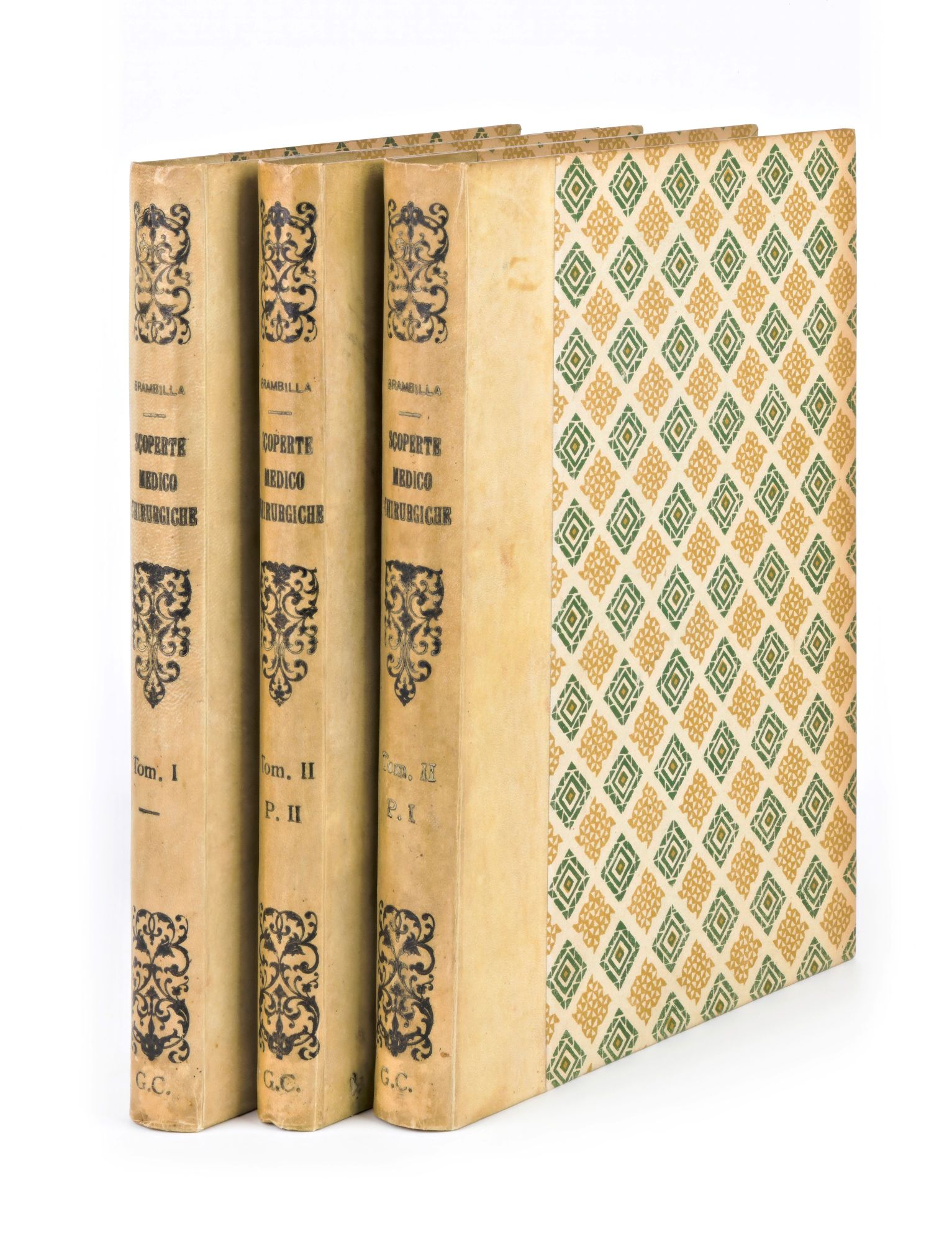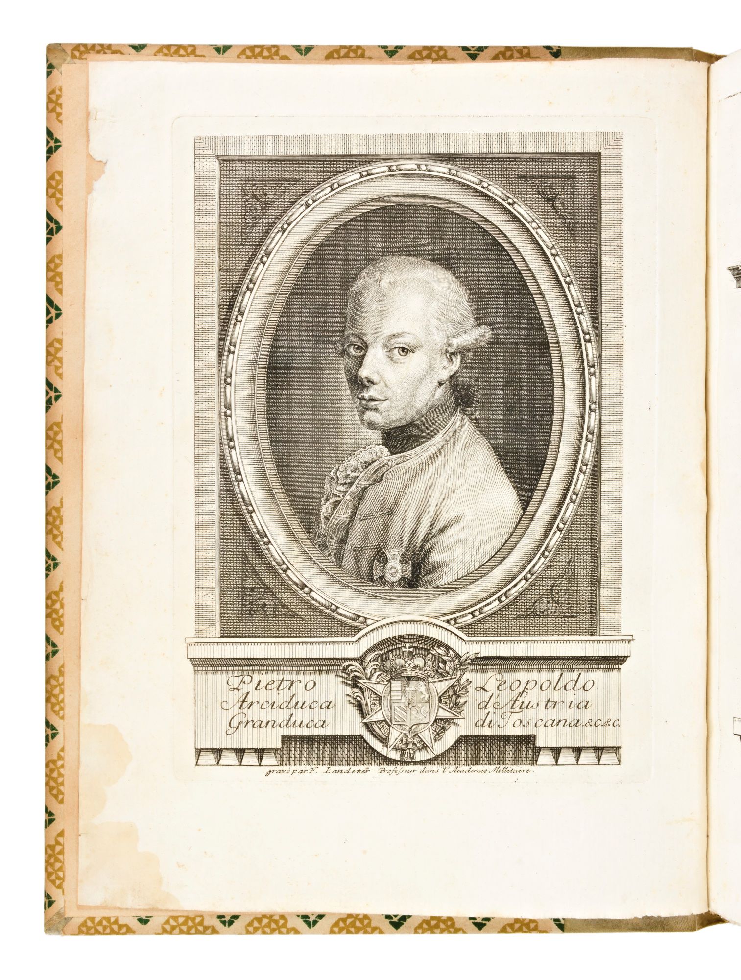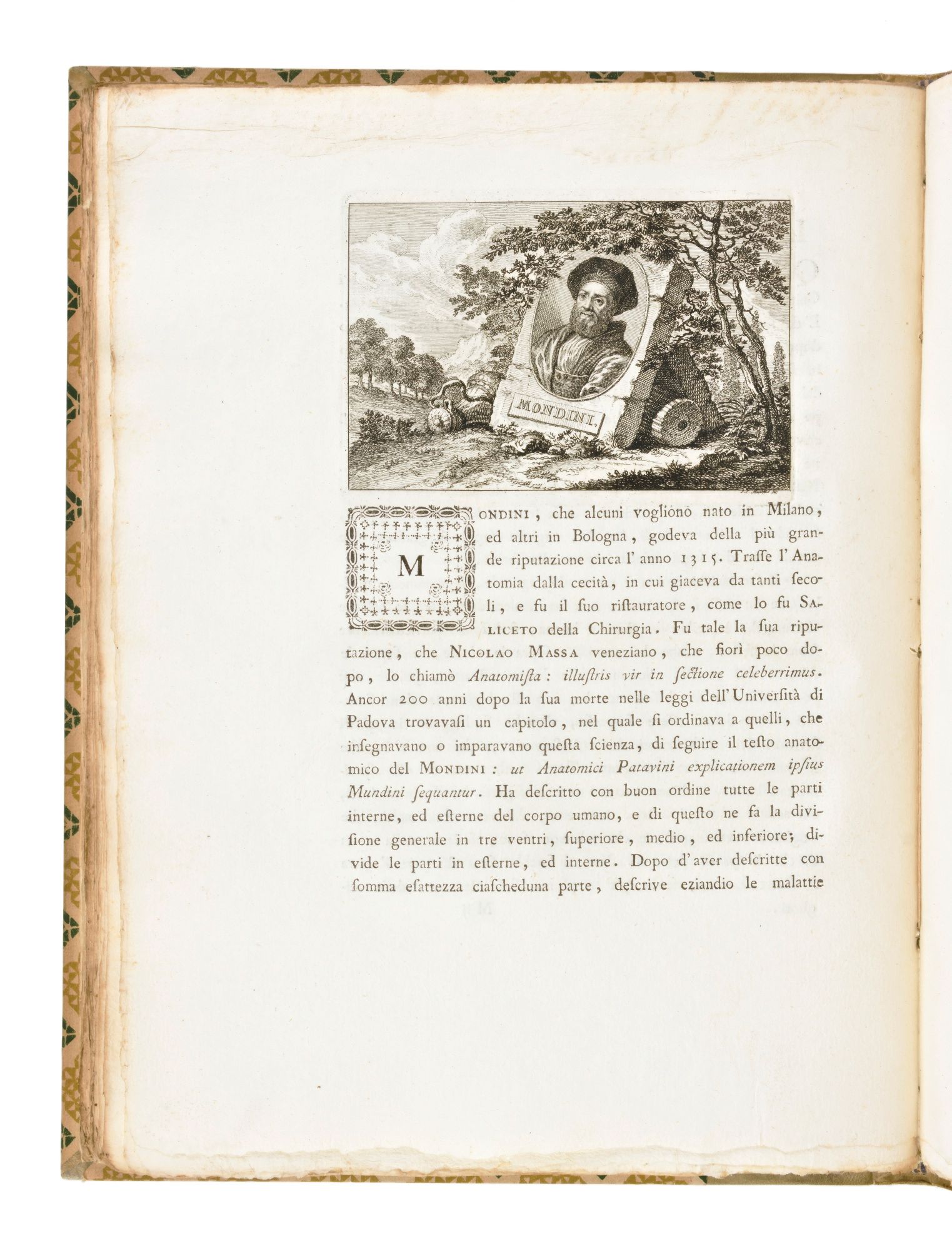 3 volumi, in-folio, mm. 300x235, pp. (16), xliii, 190. / (2), iv, 274, (18). / (10), 210, (10). Opera completa. La seconda parte è divisa in 2 volumi (con proprio front.). Frontespizi calcografici. Ritratto dell'arciduca d'Austria Pietro Leopoldo e illustrazioni di F. Landerer e I. E. Mansfeld. Testatine, finalini e 33 ritratti calcogr. di medici illustri nel testo. Rilegatura post. in mezza pergamena con titoli e fregi impressi a secco al dorso. Piatti in rivestiti in carta decorativa. Testo nitido, carte pulite. In ottimo stato di conservazione con minimi segni del tempo.