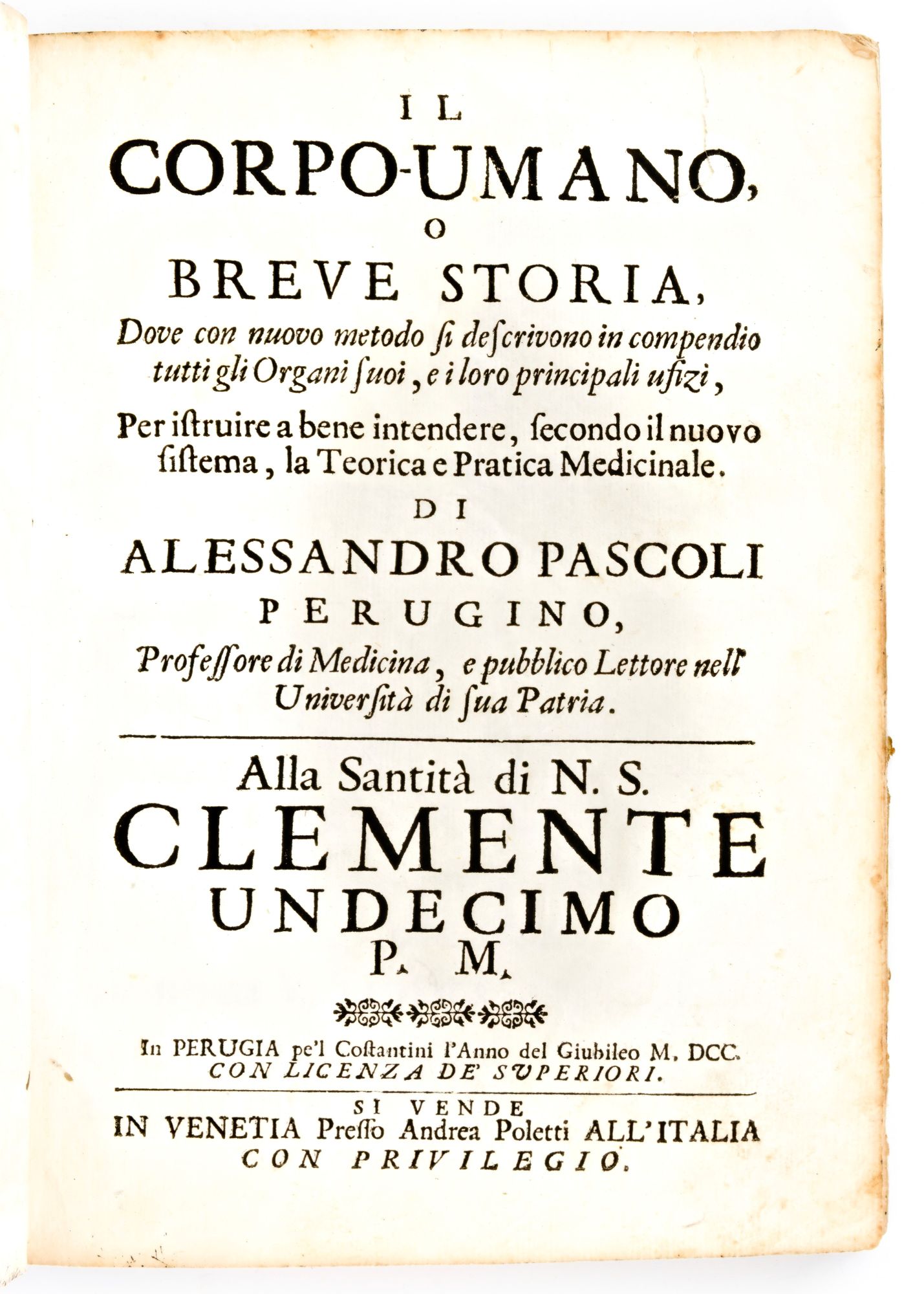 [Anatomia] Pascoli, Alessandro : Il corpo-umano, o breve storia, dove con nuovo metodo si descrivono in compendio tutti gli organi suoi, e i loro principali ufizi... G. Costantini & A. Poletti, in Perugia & Venezia 1700