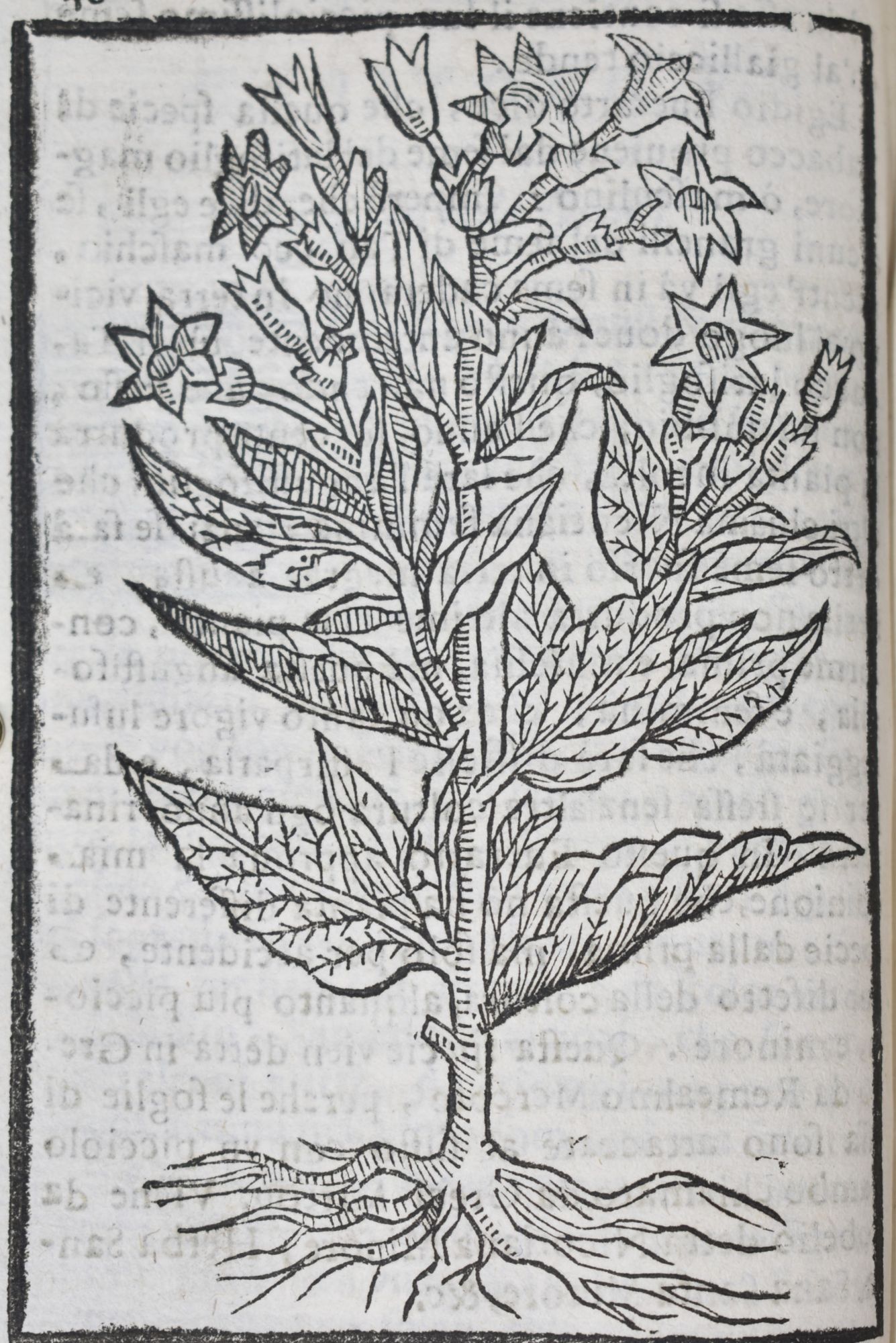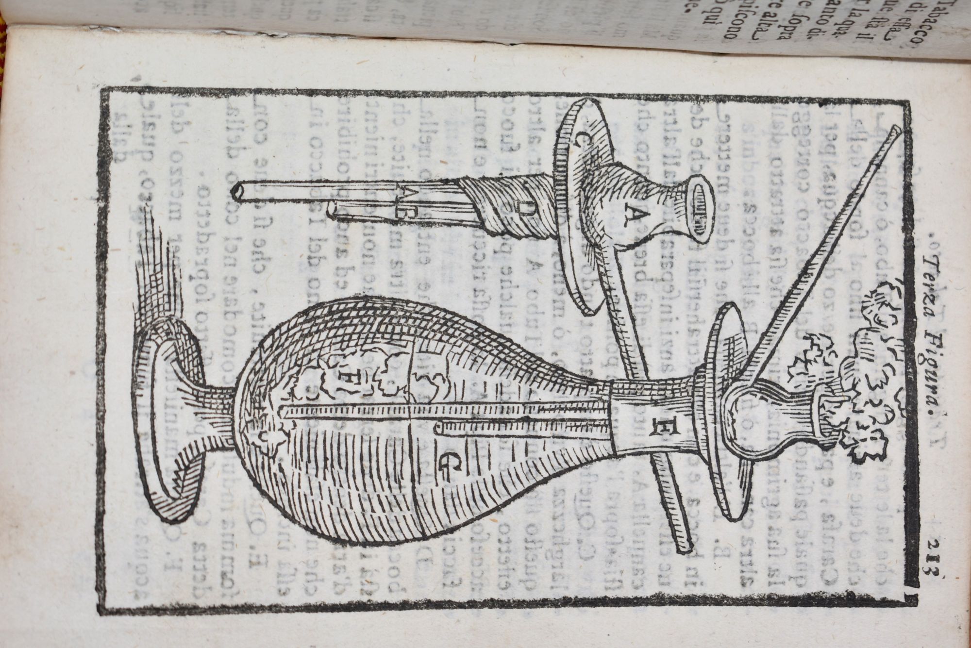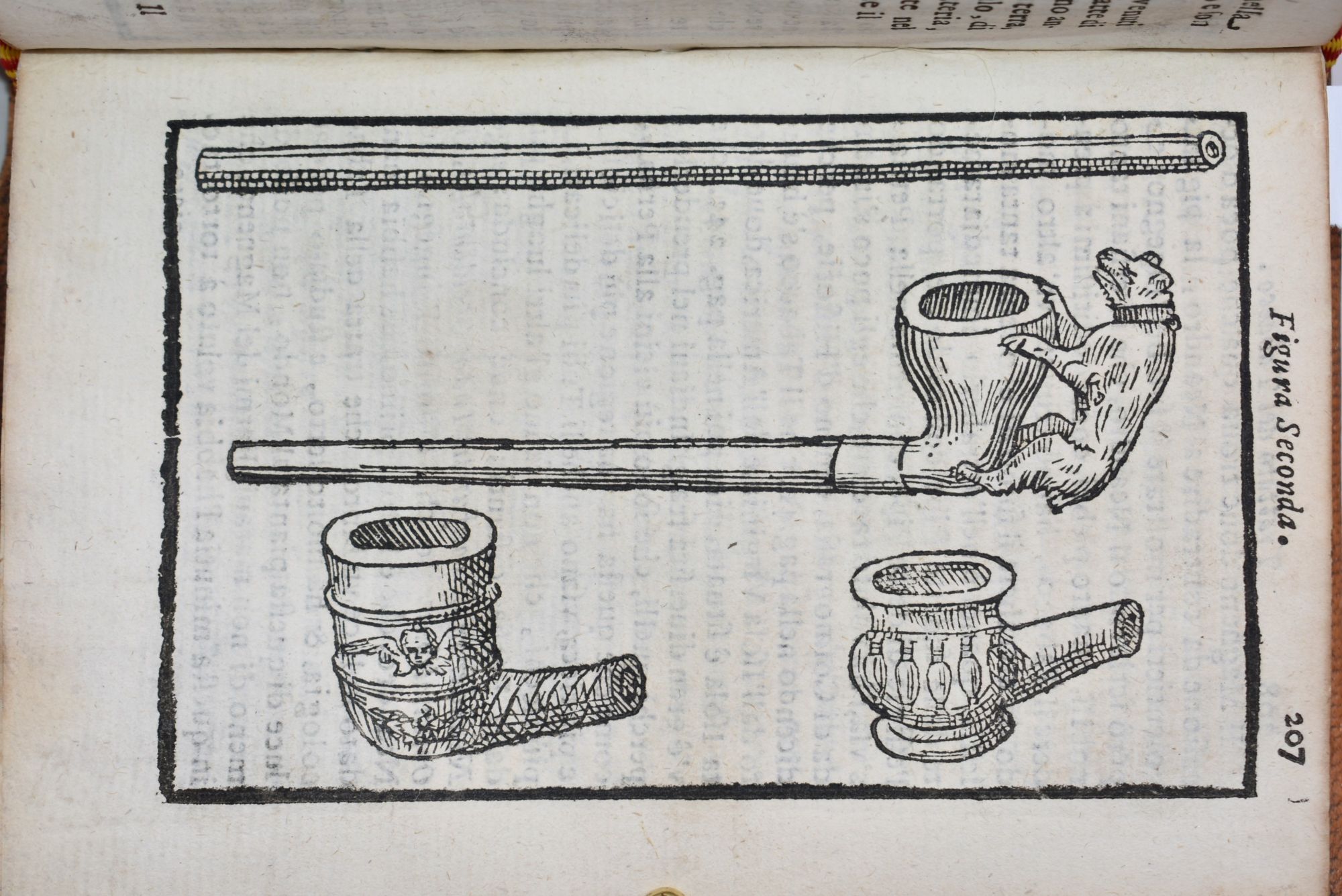 Figurato Seicentesco di farmacopea e erbologia dedicato alla pianta del tabacco e alle sue numerose applicazioni, ornato con 6 tavole incise nel testo e numerose iniziali xil. oltre a innumerevoli testatine e finalini. Esemplare caratterizzato da antiche annotazioni manoscritte in china al margine del testo, mancante delle ultime 32 pagine.