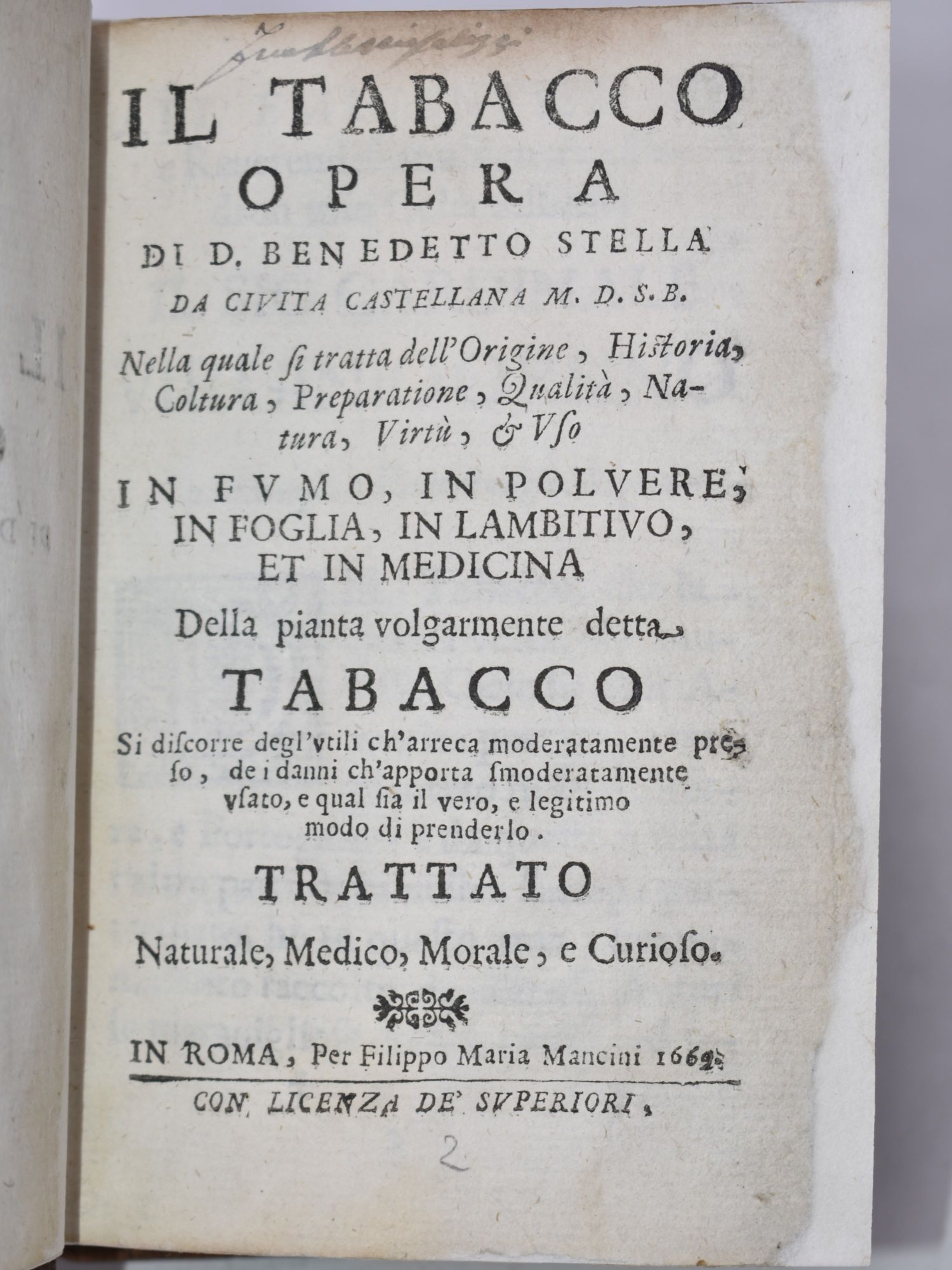 Stella, Benedetto: IL TABACCO. OPERA DI D. BENEDETTO STELLA DA CIUITA CASTELLANA M.D.S.B. NELLA QUALE SI TRATTA DELL'ORIGINE, HISTORIA, COLTURA, PREPARATIONE, QUALITÀ, NATURA, VIRTÙ & VSO IN FUMO, IN POLVERE, IN FOGLIA, IN LAMBITIUO, ET IN MEDICINA DELLA PIANTA VOLGARMENTE DETTA TABACCO … TRATTATO NATURALE, MEDICO, MORALE, E CURIOSO. Roma, 1669, per Filippo Maria Mancini.