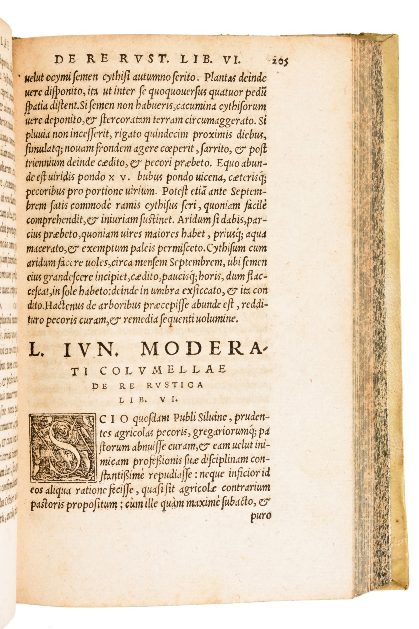 Trattato di agricoltura dello scrittore romano antico Lucio Giunio Moderato Columella (ca. 4 - 70 d.C.), il più dotto agronomo dell'antichità, scrisse quest'opera intorno al 40 d.C. Capolavoro di economia rurale dell'agronomo latino Columella (I secolo d.C.), originario di Cadice. Edizione lionese del trattato di agricoltura più completo e uno dei più interessanti che l'antichità ci abbia lasciato. L'edizione originale di quest'opera, unita a quelle di Catone, Varrone e Palladio Rutilio, fu pubblicata a Venezia, da Nicolas Jenson nel 1472. Il De re rustica è diviso in tredici libri, dodici sono in prosa e trattano della scelta dell'opera dominio, di varie colture, della cura delle api, del bestiame e degli uccelli da cortile; solo il decimo è scritto in versi, ed ha per oggetto la coltivazione dei giardini. Il tredicesimo e ultimo libro, che viene riportato in appendice o come trattato a parte, pur essendo parte integrante dell'opera, tratta della coltivazione degli alberi forestali e da frutto.